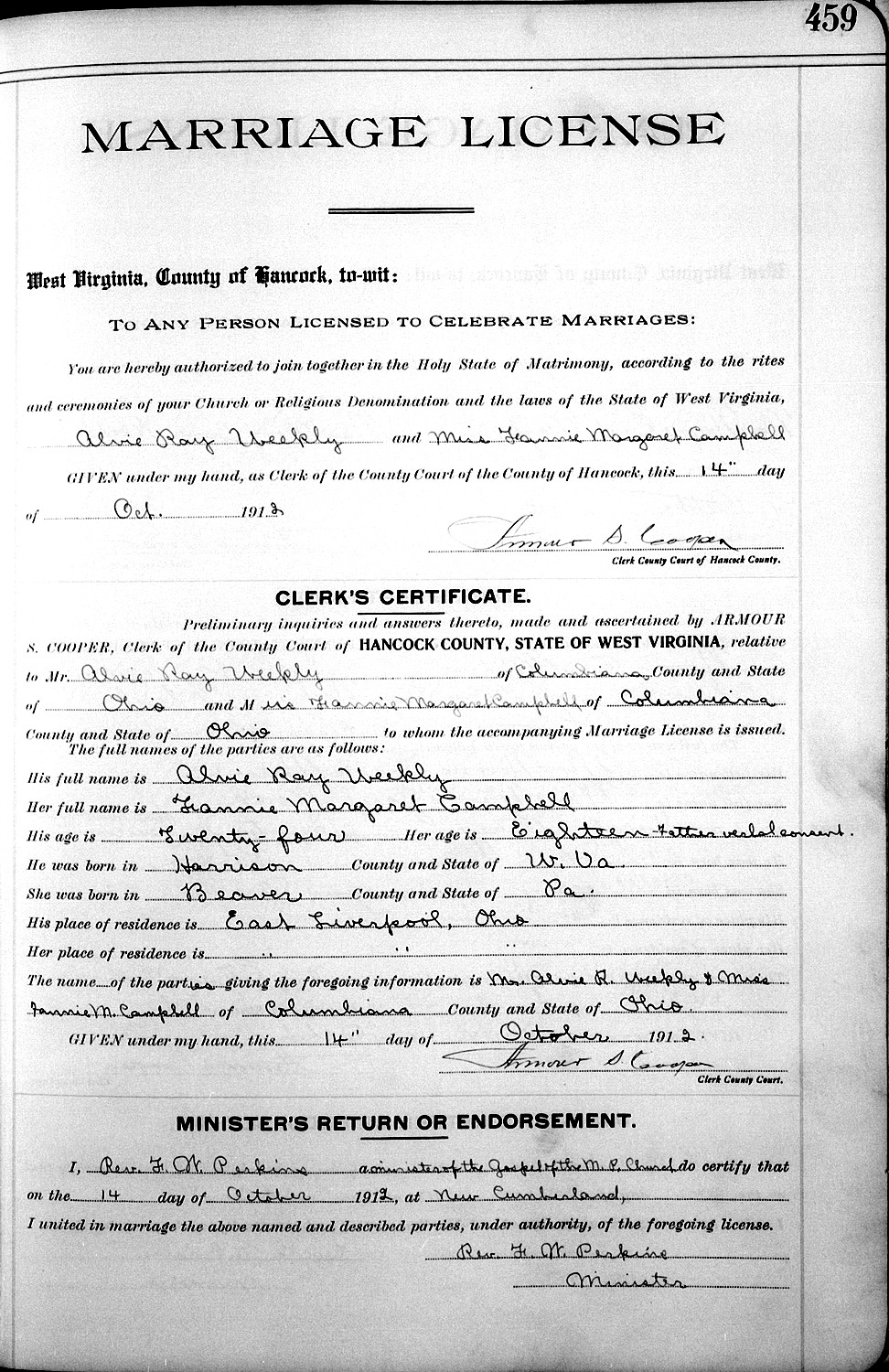 Alvie Ray Weekley and Fannie Margaret Campbell were married October 14, 1912, in New Cumberland, Hancock Co., WV.