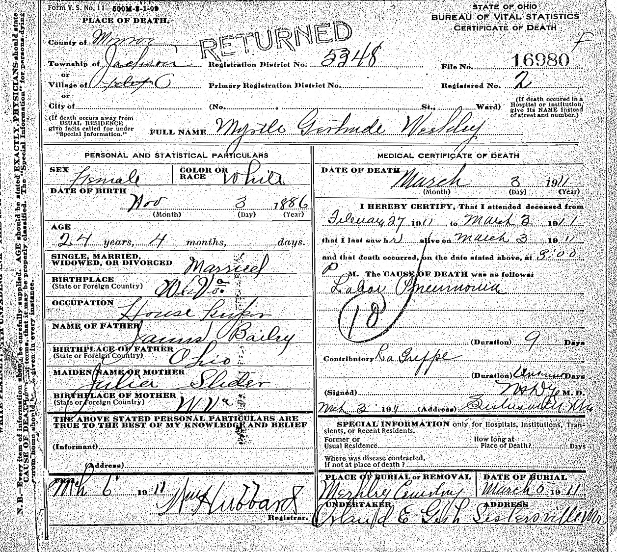 Myrtle Gertrude (Bailey) Weekley died March 3, 1911, in the Village of Felix, Jackson Twp., Monroe Co., OH, at age 24. Buried in Merhley Cemetery, Monroe Co., OH. She died from Pneumonia.