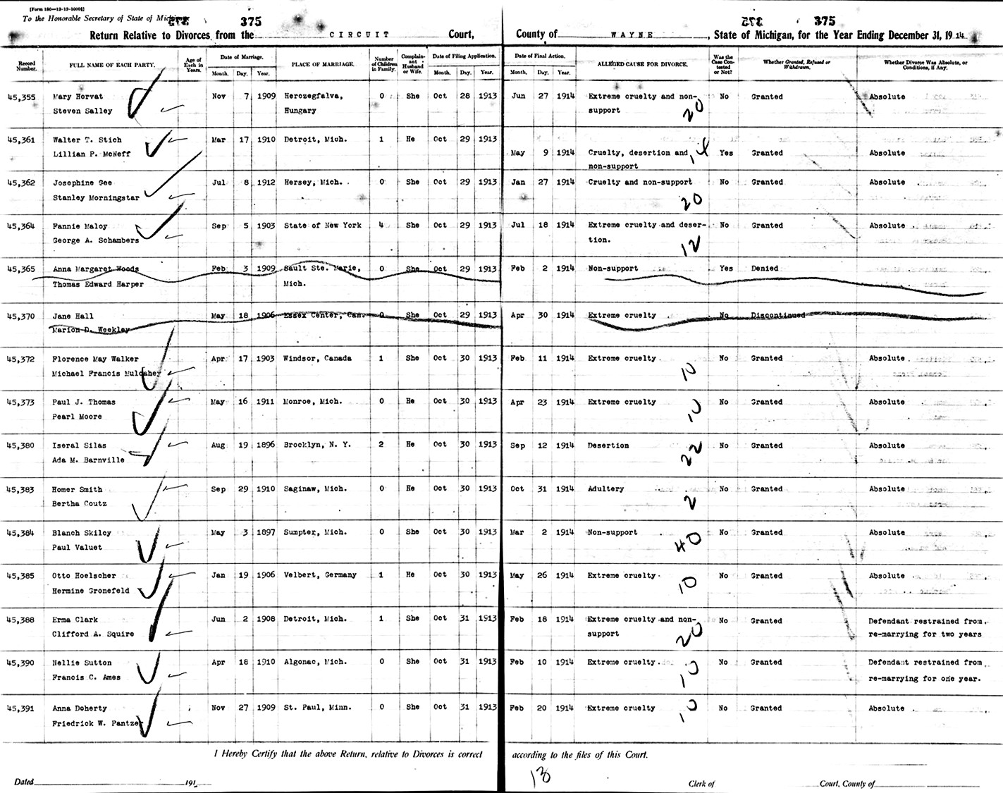 John Theodore Stanley Hodgins and Evelyn "Eva" (Reisener) (Weekley) Hodgins were divorced April 20, 1922, in Detroit, Wayne Co., MI. He had charged Extreme Cruelty and Habitual Drunkenness. It was uncontested.