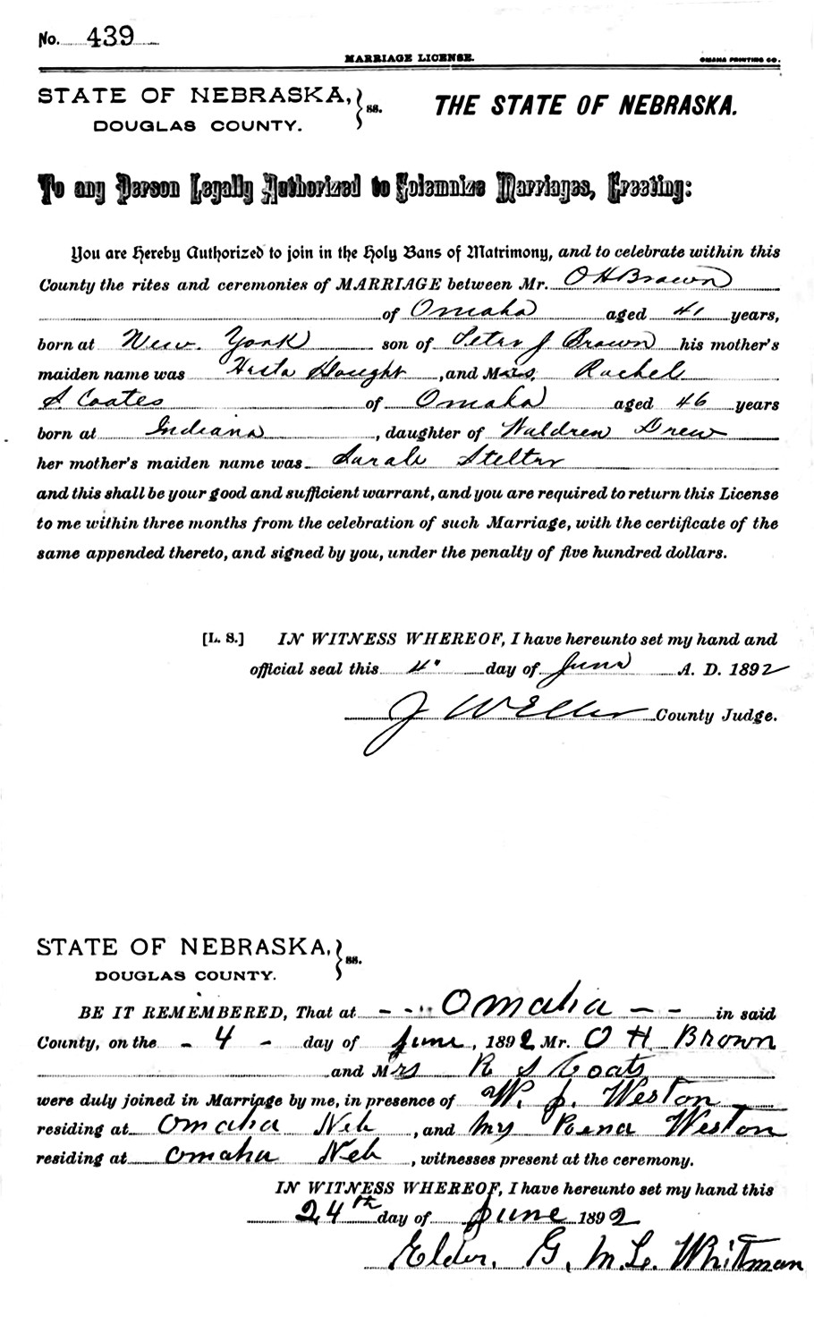 Oscar H. "O. H." Brown and Rachael Susannah "Rachel" (Drew) Coates were married June 4, 1892, in Omaha, Douglas Co., NE.