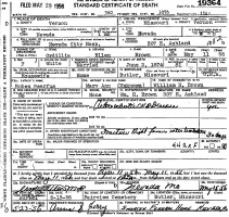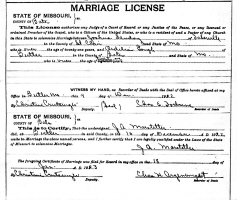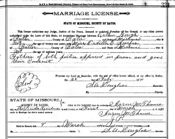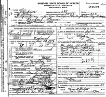 - William Henry Brown: Born January 12, 1875, in Omaha, Douglas Co., NE; Died June 8, 1956, at South Austin Hospital, Butler, Bates Co., MO (age 81). Buried in Fairview Cemetery, Bates Co., MO. Married (1) about 1900 in Nebraska, to Margaret E. "Maggie" Feagins/Fegan: Born September, 1882, in Nebraska to Ohio and Iowa-born parents; Died Unknown. Married (2) after 1920 in Bates Co., MO, to Ordillia Ellen "Della" (Searfus) Sandage: Born June 3, 1874, in Butler Co., MO; Died May 11, 1956, at Nevada City Hospital, Nevada, Vernon Co., MO (age 81). Buried in Fairview Cemetery, Bates Co., MO. She was first married (1) March 1, 1891, in Bates Co., MO, to Eugene Arthur "Henry" Gough: Born March 1, 1870, in Christian Co., IL; Died August 8, 1917, in Butler, Bates Co., MO (age 47). Then married (2) December 10, 1922, in Butler, Bates Co., MO, to Joshua Sandage: Born November 10, 1859, in Indiana; Died March 3, 1931, in Lone Oak Twp., Bates Co., MO (age 71).