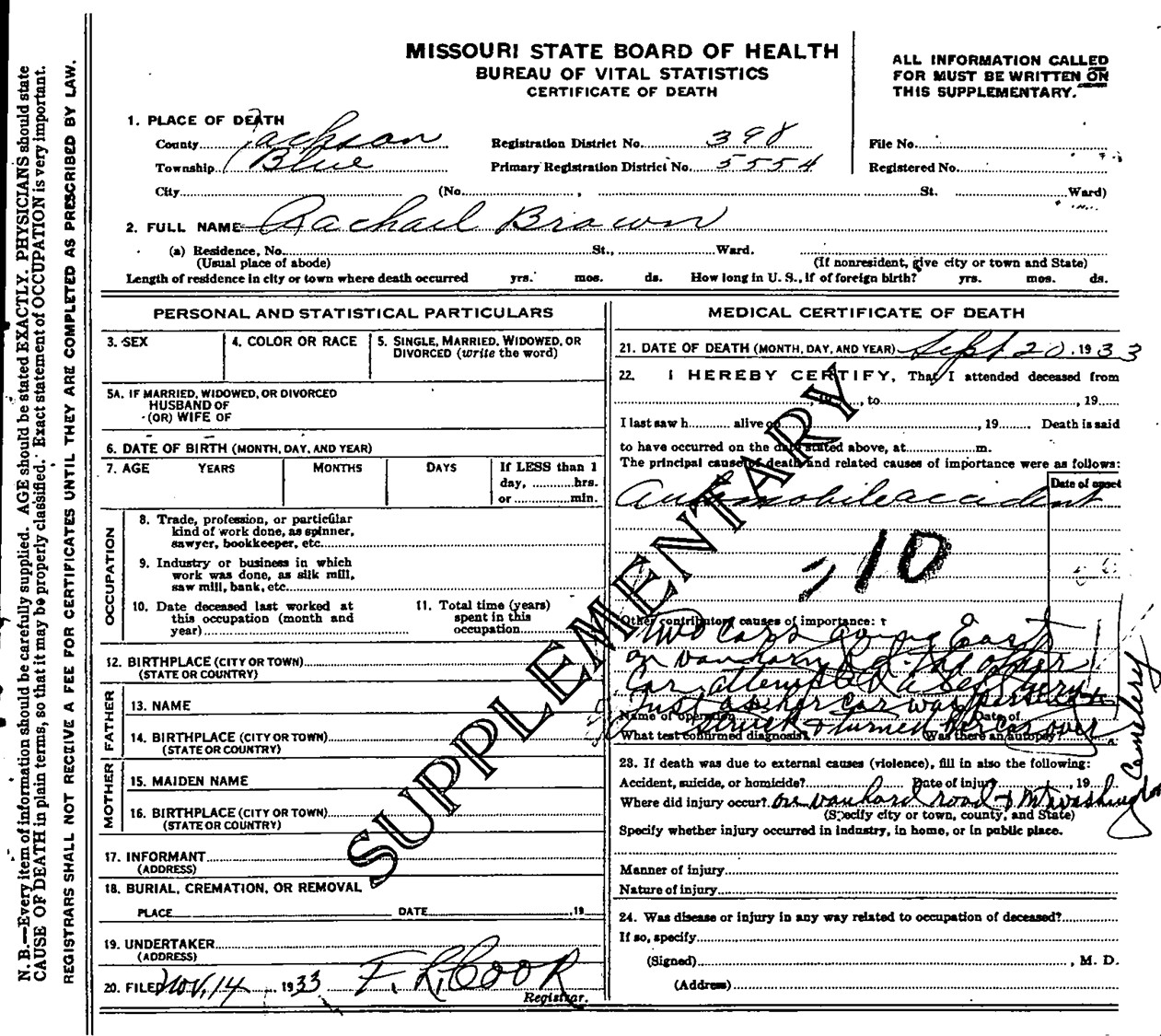 Rachael Susannah "Rachel" (Drew) (Coates) Brown died September 20, 1933, in Blue Twp., Jackson Co., MO, at age 87. Buried in Dorchester Cemetery, Saline Co., NE.