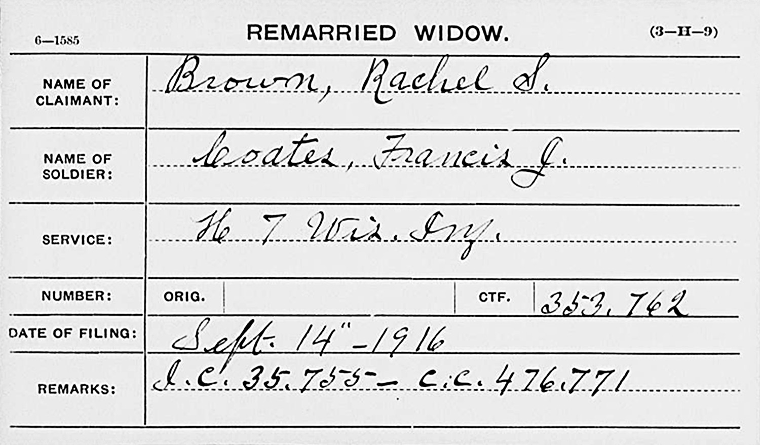 On September 14, 1916, Rachael Susannah "Rachel" (Drew) (Coates) Brown filed a Remarried Widow Claim.