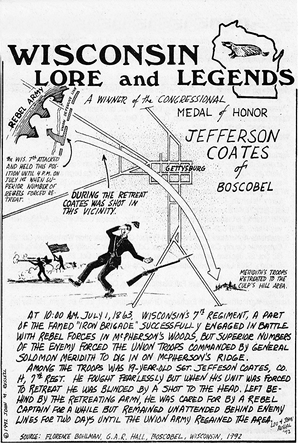 On the first day, July 1, 1863, Sgt. Jefferson Coates of Company H, 7th Wisconsin Infantry, was wounded during heavy fighting along McPherson's Ridge. His citation reads : "Unsurpassed courage in battle, where he had both eyes shot out," according to The Medal of Honor at Gettysburg by B. T. Arrington (Thomas Publications, Gettysburg, Pa.).