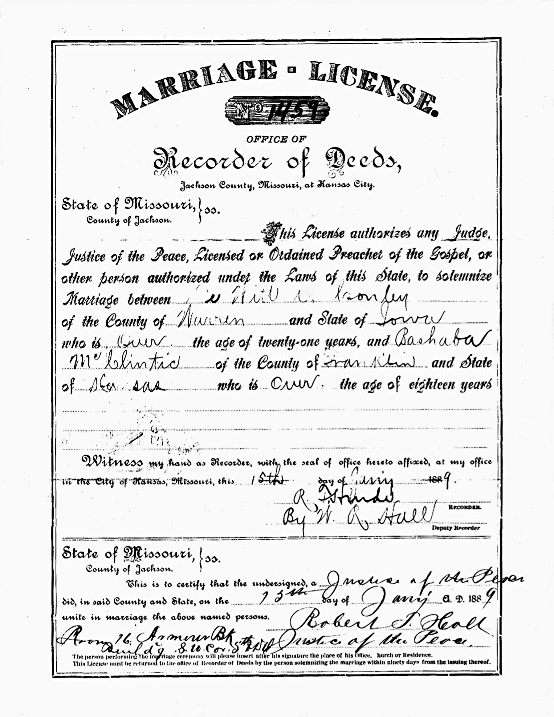 - George V. Brown: Born about 1873 in Omaha, Douglas Co., NE; Died after 1894 in Unknown. Married August 1, 1894, in Missouri Valley, Harrison Co., IA, to Barsheba G. "Babsby" (McClintock) Connelly: Born July 23, 1868, in Kansas; Died 1894 - 1913 in Unknown. Her parents are James W. McClintock of Indiana and Mary Sherley "Polly" Wells of Kentucky. James and Mary were married May 24, 1855, in Leavenworth, Leavenworth Co., KS. Barsheba and Dewitt Douglas Connelly (born December, 1858, in Iowa; died March 25, 1922, in Olmstead, MN) were married January 15, 1889, in Kansas City, Jackson Co., MO.