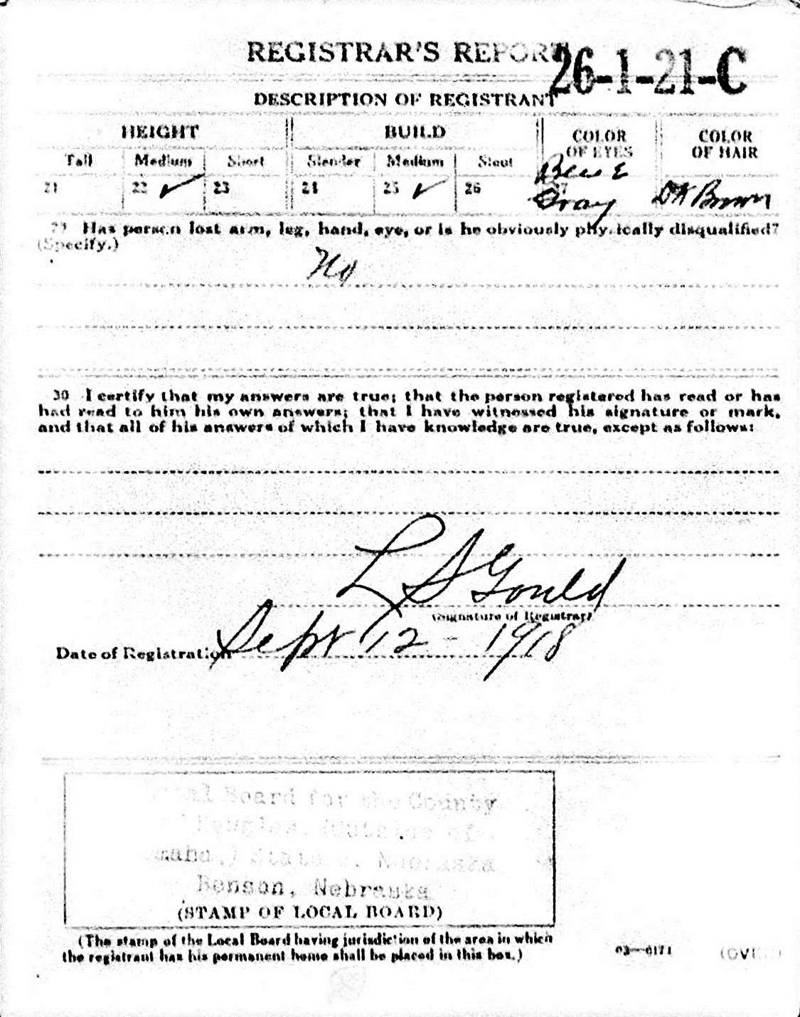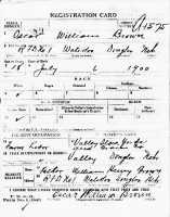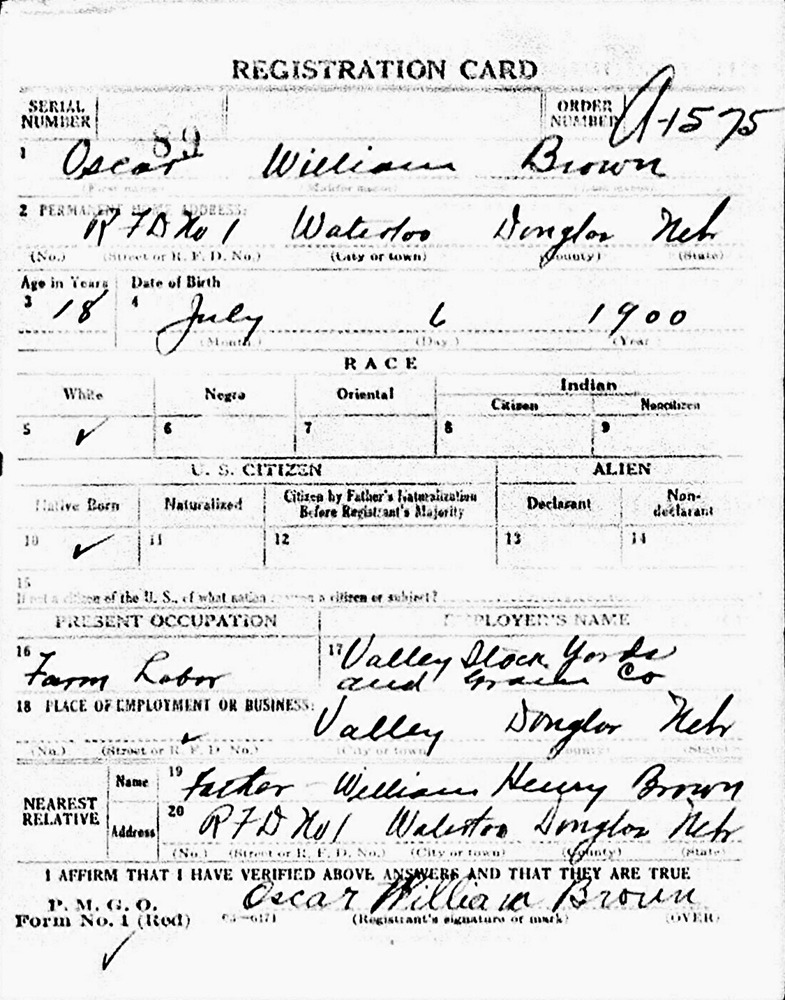 The WWI Draft Registration Report dated September 12, 1918, shows Oscar William Brown, age 18, born July 6, 1900, is living at RFD No. 1, Waterloo, Douglas Co., NE. His father is William Henry Brown of the same location.
