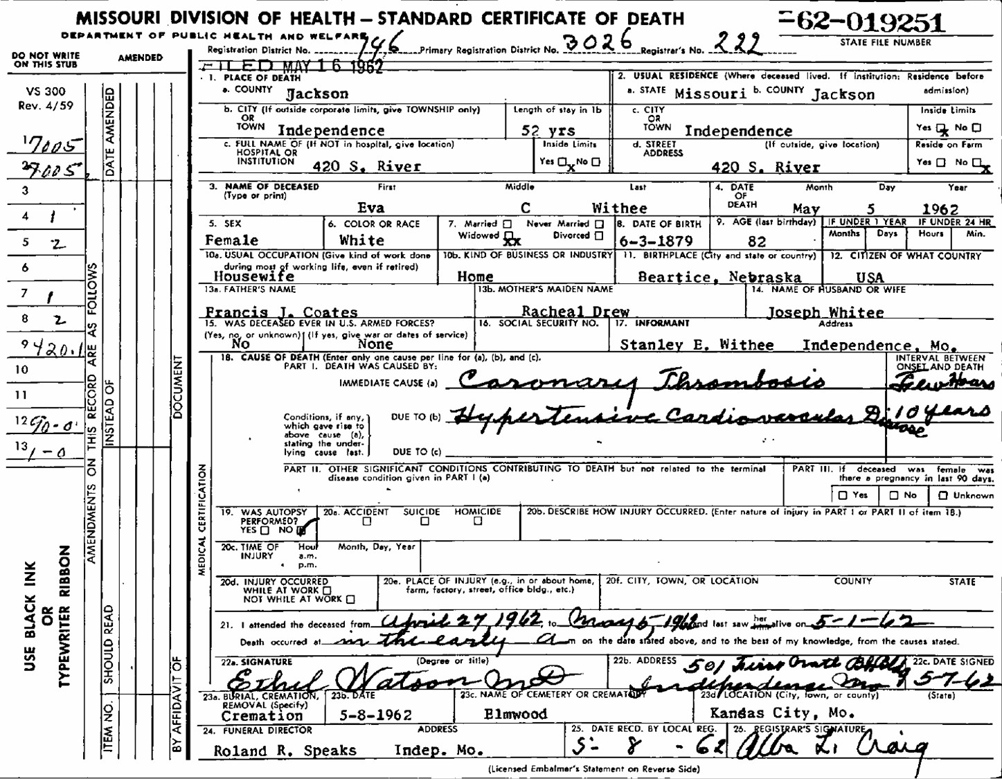 Eva Melissa (Coates) Withee died May 5, 1962, in Independence, Jackson Co., MO, at age 82. Buried in Forest Lawn Memorial Park, Omaha, Douglas Co., NE.