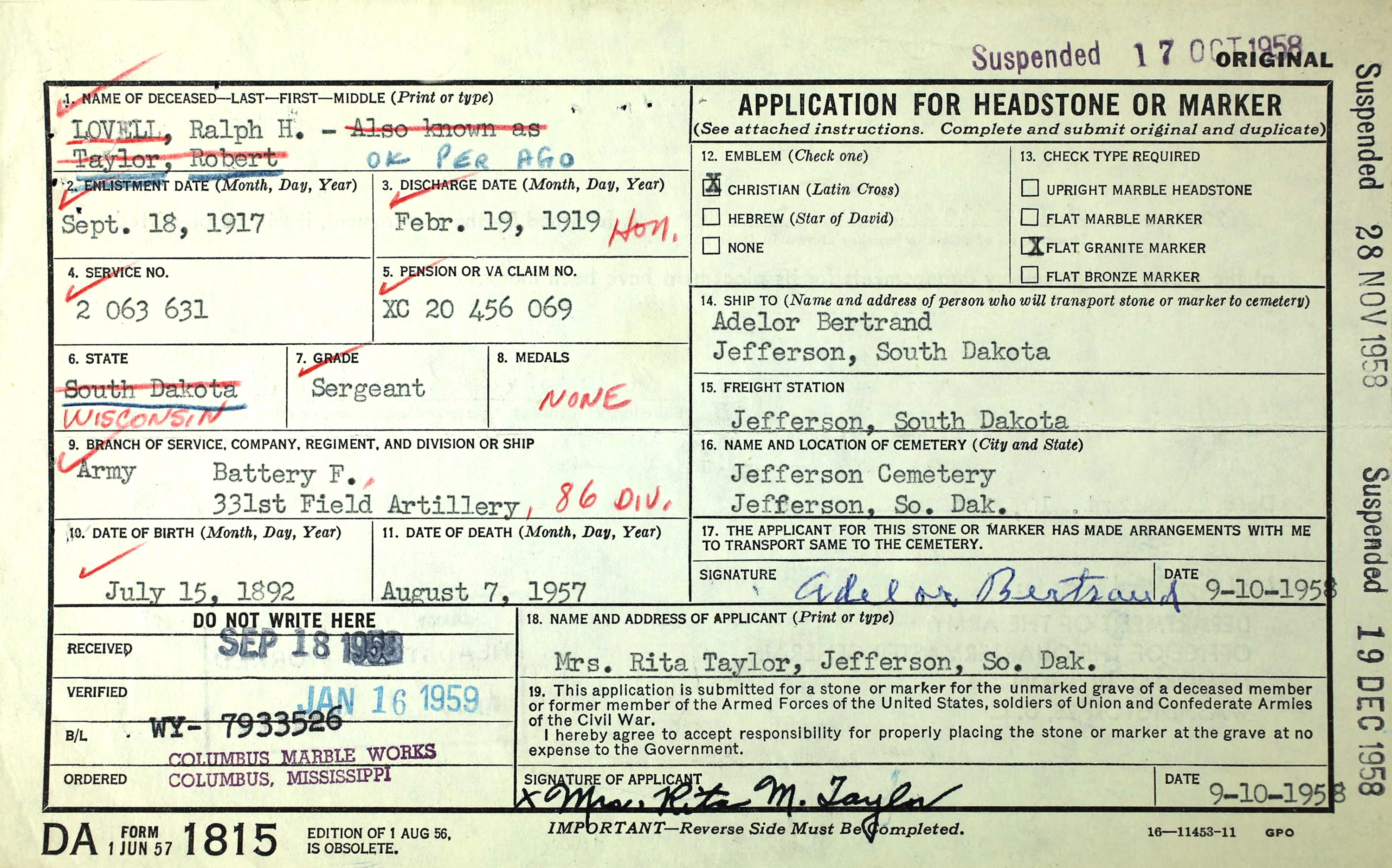 Ralph Herbert Lovell (a/k/a Robert Taylor) was born July 15, 1892, in the Town of Orion, Richland Co., WI, and supposedly died by murder about September 16, 1929, in Cavalier Co., ND, at age 37. However, he instead changed his name to Robert Taylor, and died August 7, 1957, in Jefferson, Union Co., SD, at age 65. Buried in Saint Peters Cemetery, Jefferson, Union Co., SD. He is the son of Charles Herbert Lovell of Milwaukee, Milwaukee Co., WI, and Dora Belle Blake of the Town of Orion, Richland Co., WI.