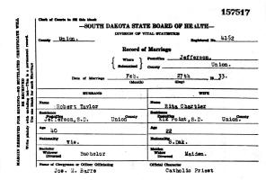 Robert Taylor (age 40), a married but not divorced man, and Rita Marie Chartier (age 22), a maiden, were married February 27, 1933, in Jefferson, Union Co., SD.