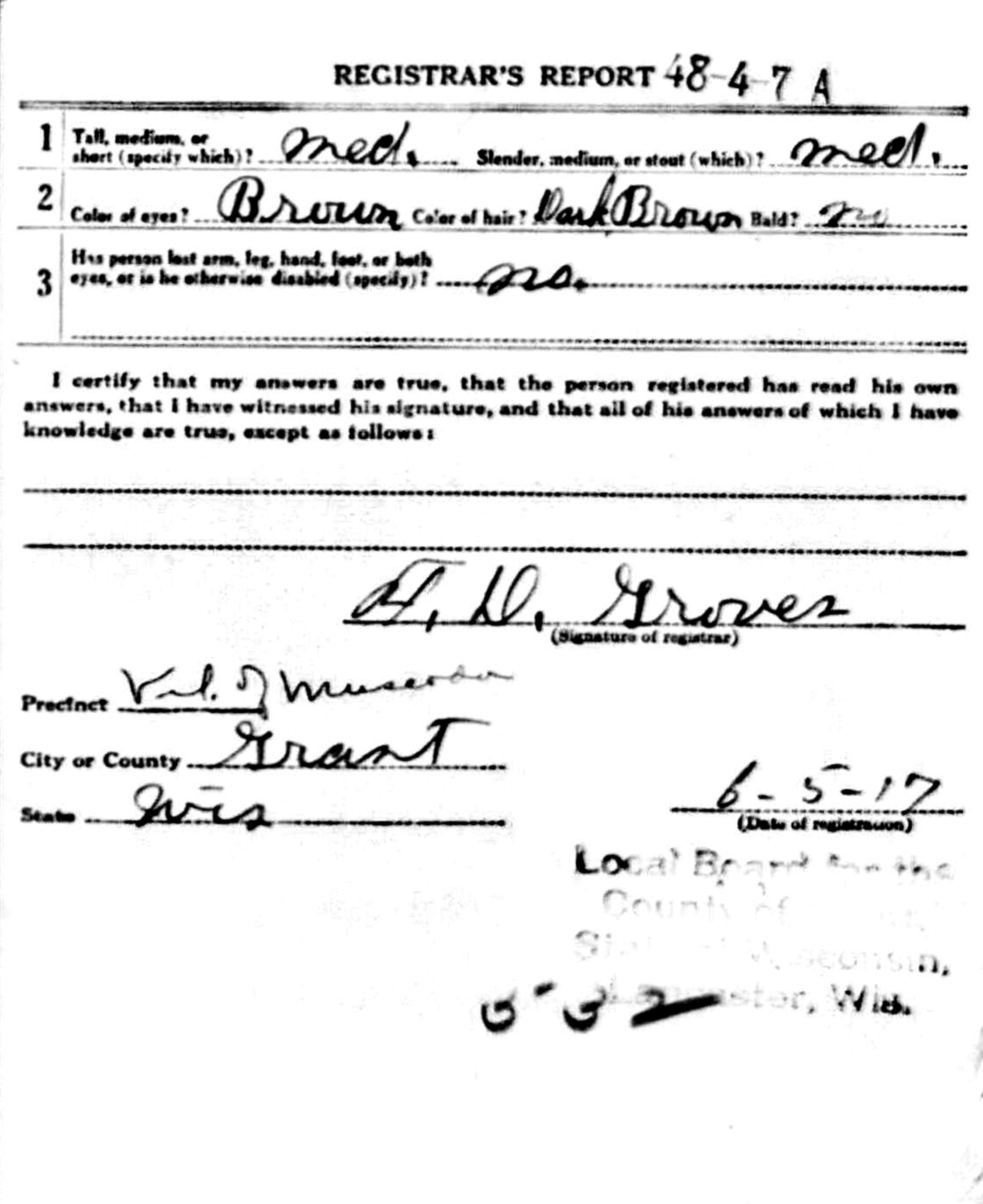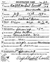 The June 5, 1917, WWI Draft Registration Report shows Ralph Herbert Lovell (age 24) born July 15, 1892, in Orion, WI, is an unmarried Farmer, and is living in Muscoda, WI. He is claiming a draft exemption based upon being in farming.