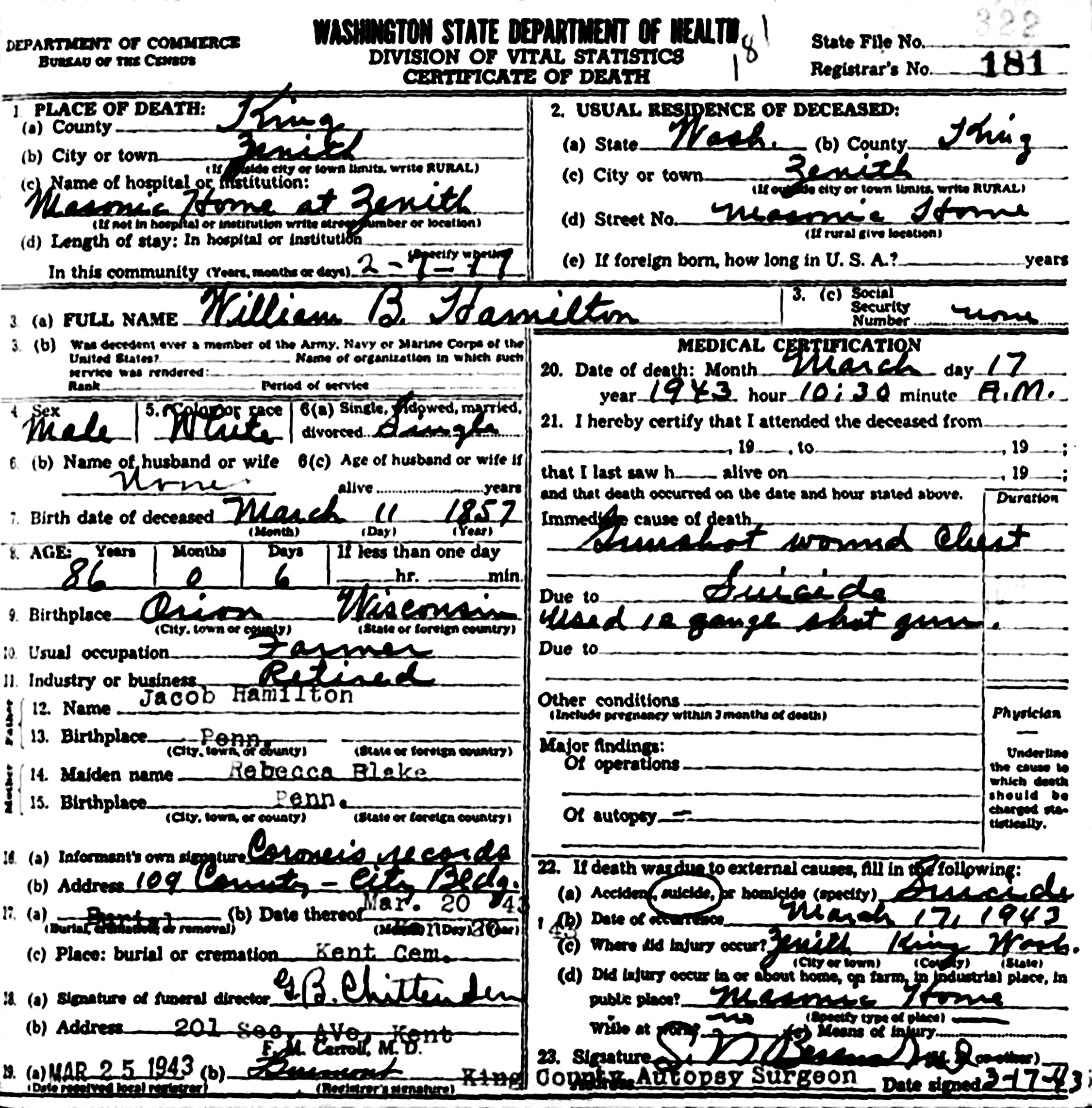 William Byrdine Hamilton died Wednesday, March 17, 1943, at the Masonic Home, Zenith, King Co., WA, at age 86. He committed suicide. Buried in Hillcrest Burial Park, Kent, King Co., WA.