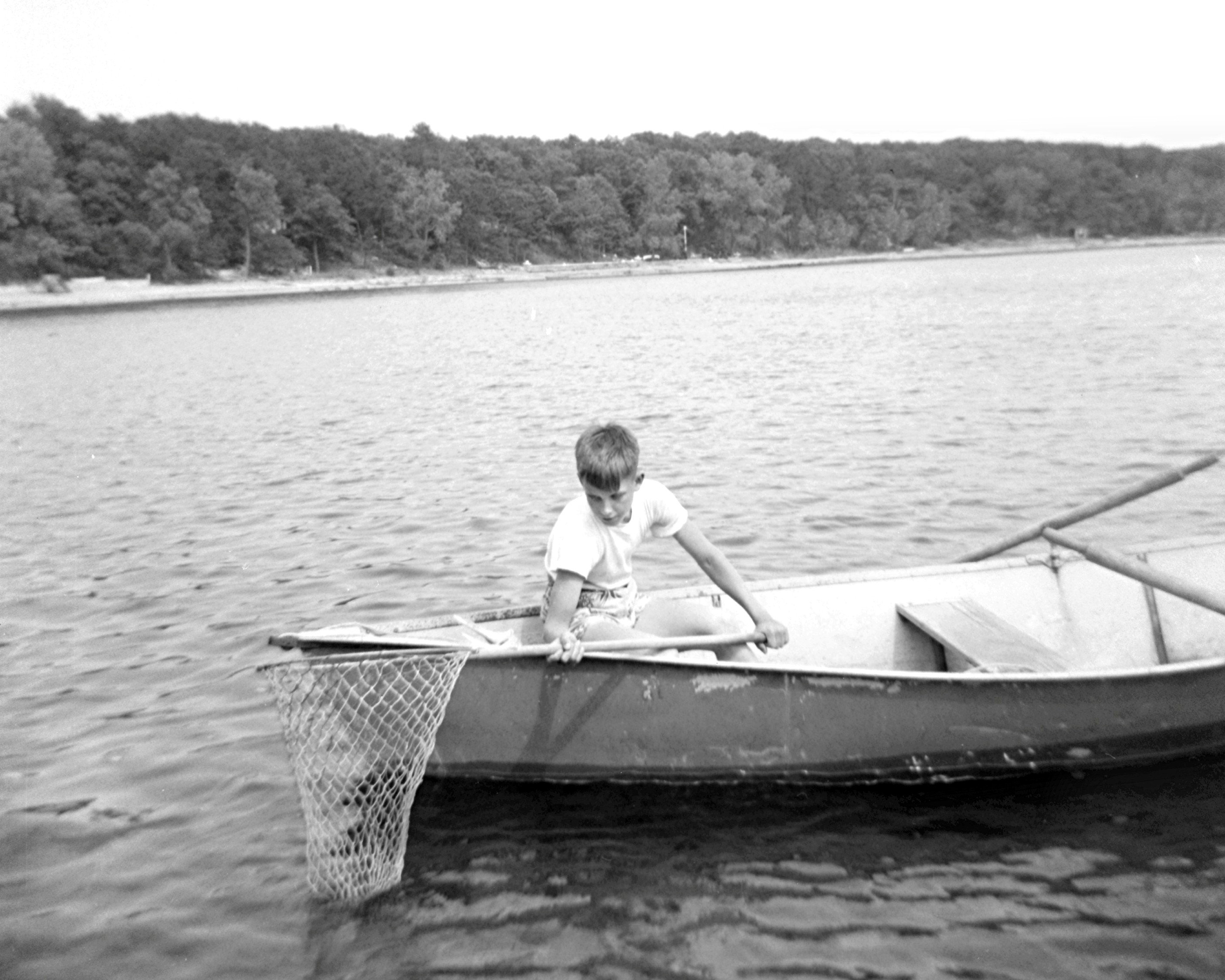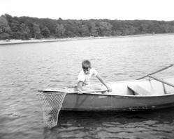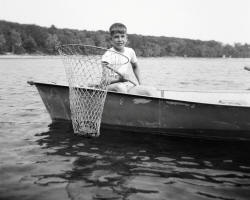 Reed Larson and the turtle he caught while diving to near the bottom of the lake, using a landing net, Bickett cottage, Pine Lake, Town of Springwater, Waushara Co., WI, Summer, 1953.