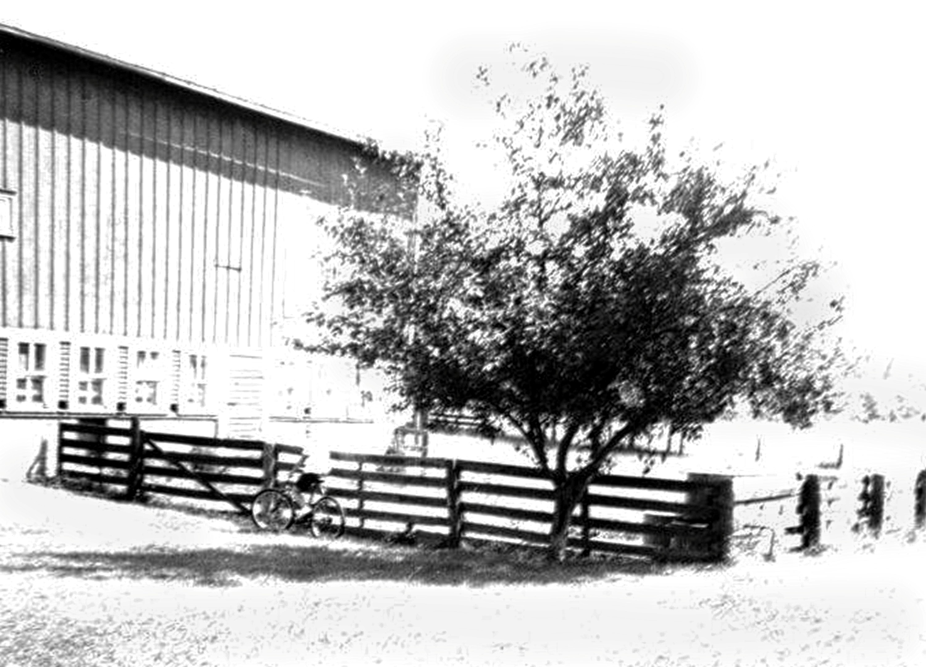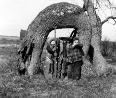 LeRoy "Pal" Bickett with grandsons Leigh Larson, Kirt Fiegel, and Reed Larson, Le-Ki-Re Ranch, Town of Shields, Dodge Co., WI, about 1945. The dog is the Larson dog, Dinah, a Cocker Spaniel. Please note "The End of the Trail Tree."