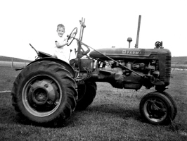 Reed Larson driving Almo Larson's tractor, Larson farm, Town of Farmington, Waupaca Co., WI, about 1947