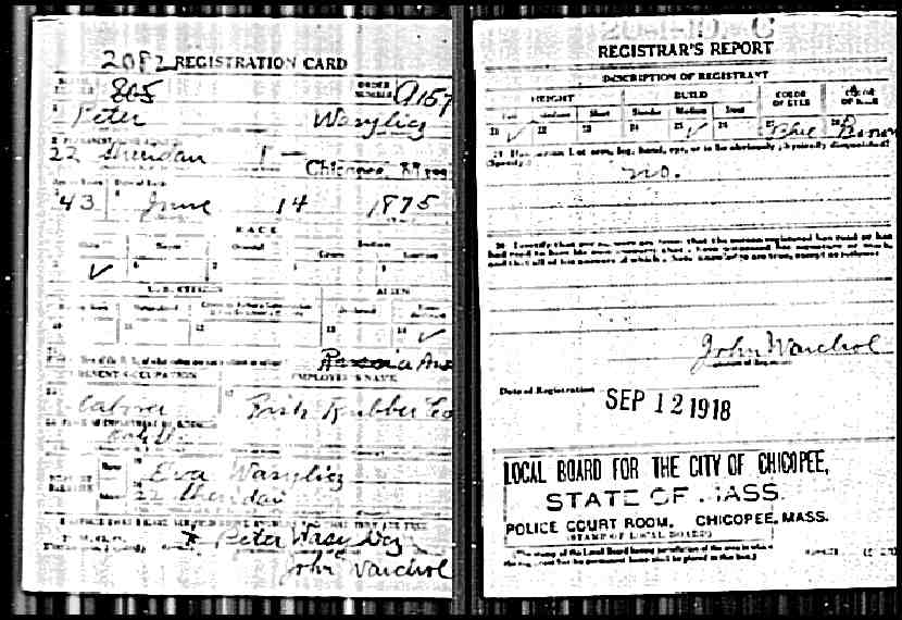The WWI Draft Registration Report dated September 12, 1918, shows Peter Wasylicz (age 43) born June 14, 1875, in Austria is a Calxxx for Fisk Rubber Co. and is living at 22 Sheridan St., Chicopee, Hampden Co., MA. His nearest relative is Eva Wasylicz of 22 Sheridan.