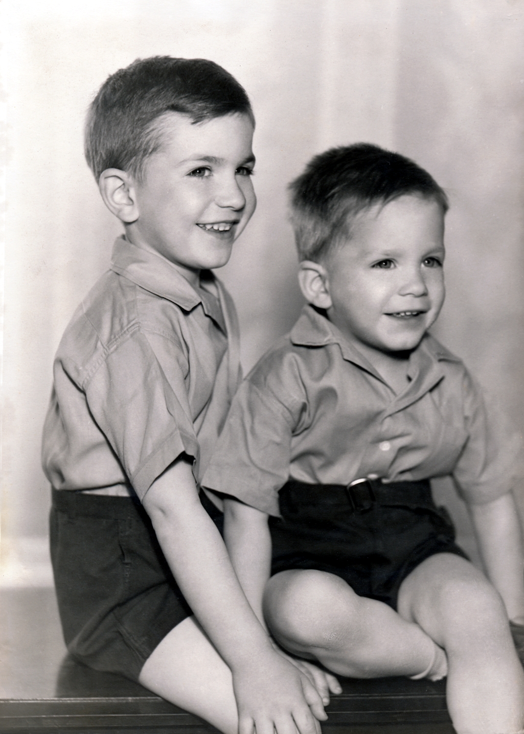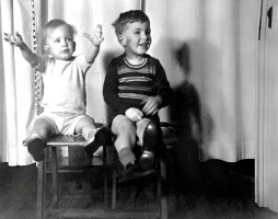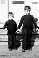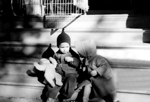 Leigh Larson and Reed Larson on Bickett steps, Bickett residence, 700 Clyman Street, Watertown, Jefferson Co., WI, about 1943.