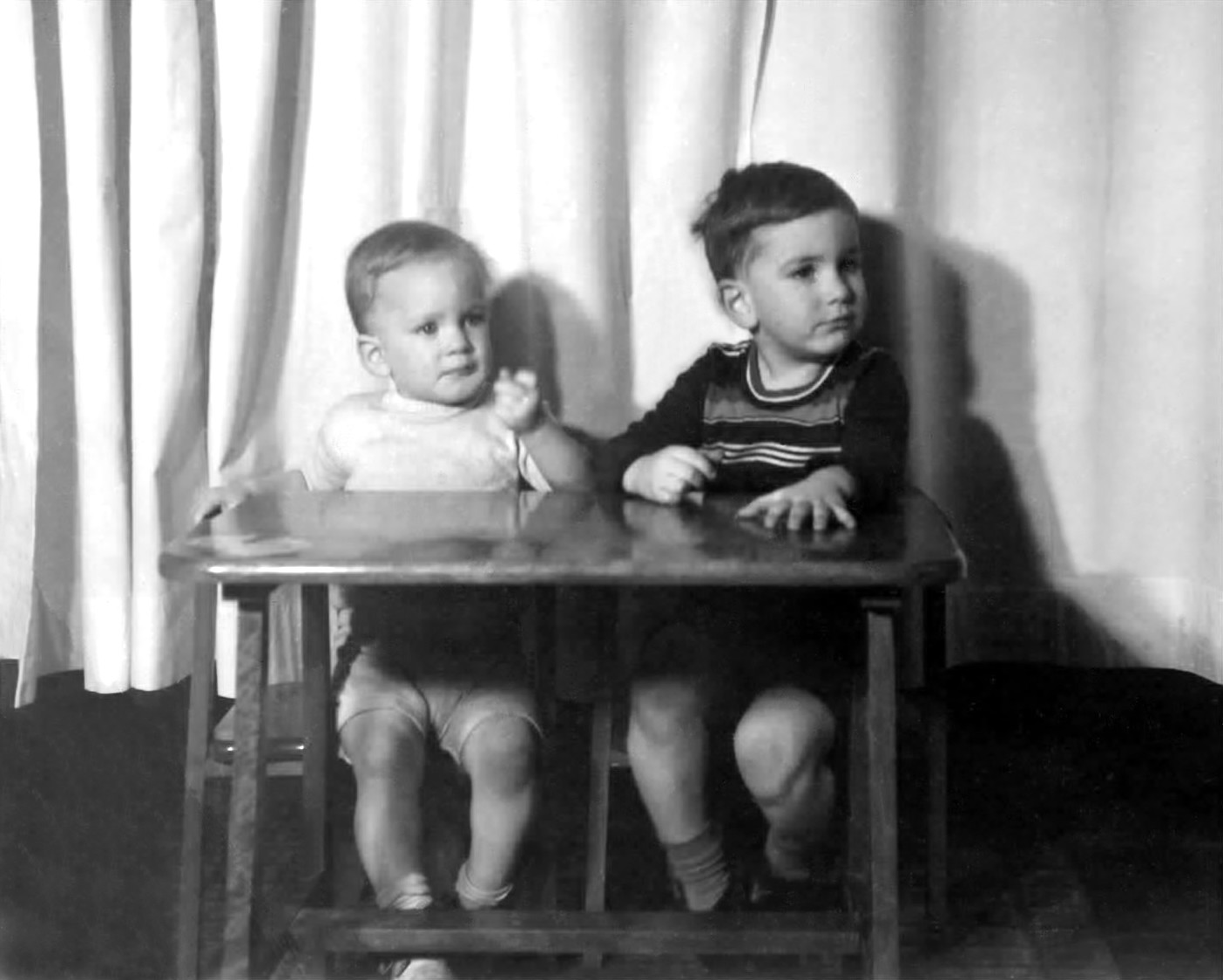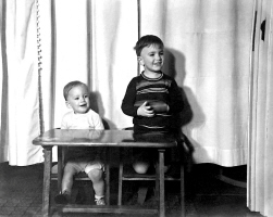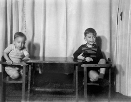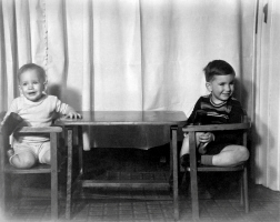 Reed Larson and Leigh Larson at toddler table, Bickett residence, 700 Clyman Street, Watertown, Jefferson Co., WI, about 1943.