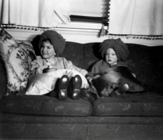 Leigh Larson and Reed Larson in Raggedy Andy hat costumes, Bickett residence, 700 Clyman Street, Watertown, Jefferson Co., WI, 1943.