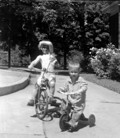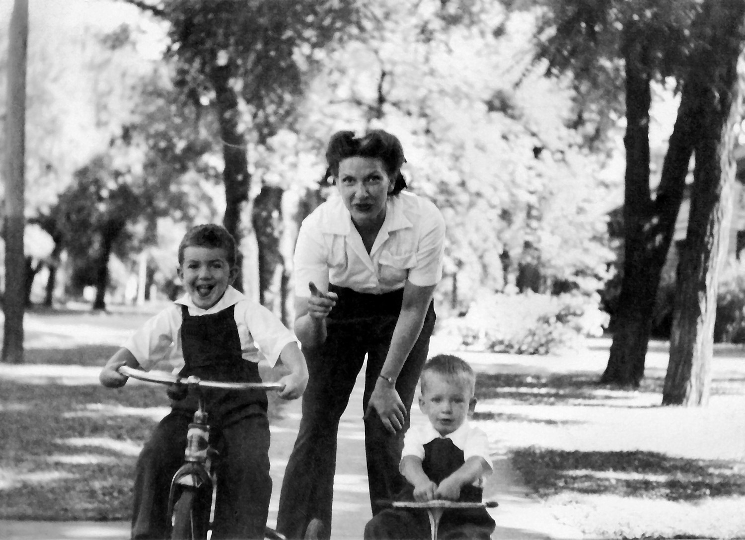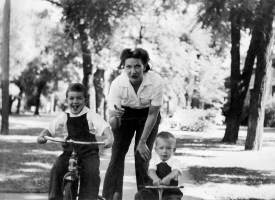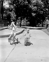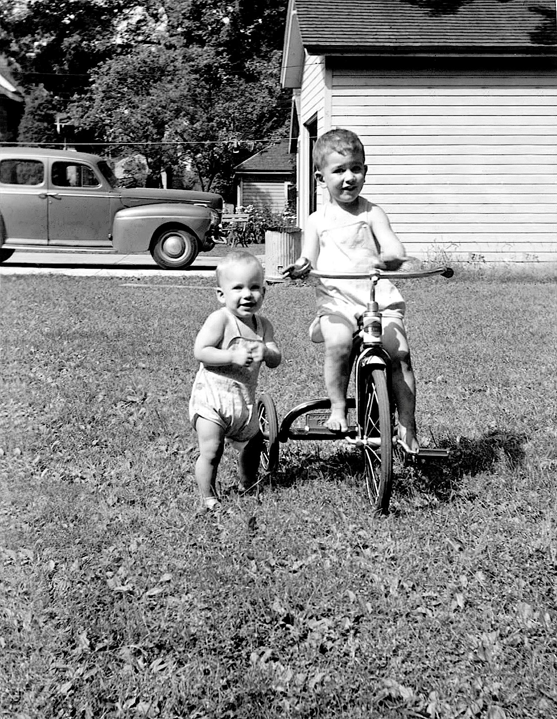 Leigh Larson and Reed Larson on tricycles, with Ruth (Bickett) Larson, Bickett residence, 700 Clyman Street, Watertown, Jefferson Co., WI, about 1943. Almo Larson's 1941 Ford Deluxe 4-Door Sedan, is in the background.