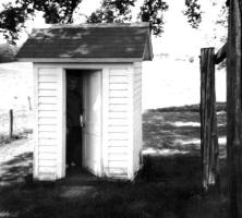 Joyce Larson in old outhouse, Larson Farm, ca. 1960.