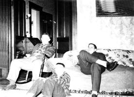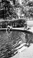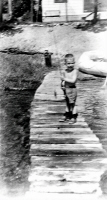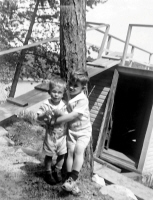 Reed Larson and Leigh Larson at the Pine Lake boathouse, Pine Lake, Town of Springwater, Waushara Co., WI, 1944.