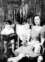 Leigh Larson, Reed Larson, and Ruth (Bickett) Larson, Bickett residence, 700 Clyman Street, Watertown, Jefferson Co., WI, Christmas, 1942.