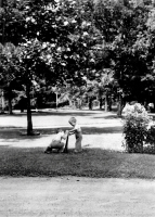Minnie the Bickett family dog, Reed Larson, and Leigh Larson, Bickett residence, 700 Clyman Street, Watertown, Jefferson Co., WI, about 1943.