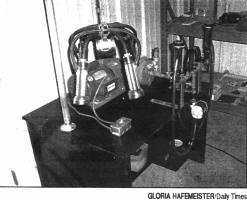A milking unit, hanging on the left, shows how the inflations fit into the whole assembly. On the right side an inflation is placed on a tester that simulates the milking action. The tester runs 24 hours a day to see how long the inflation can be used before wearing out.