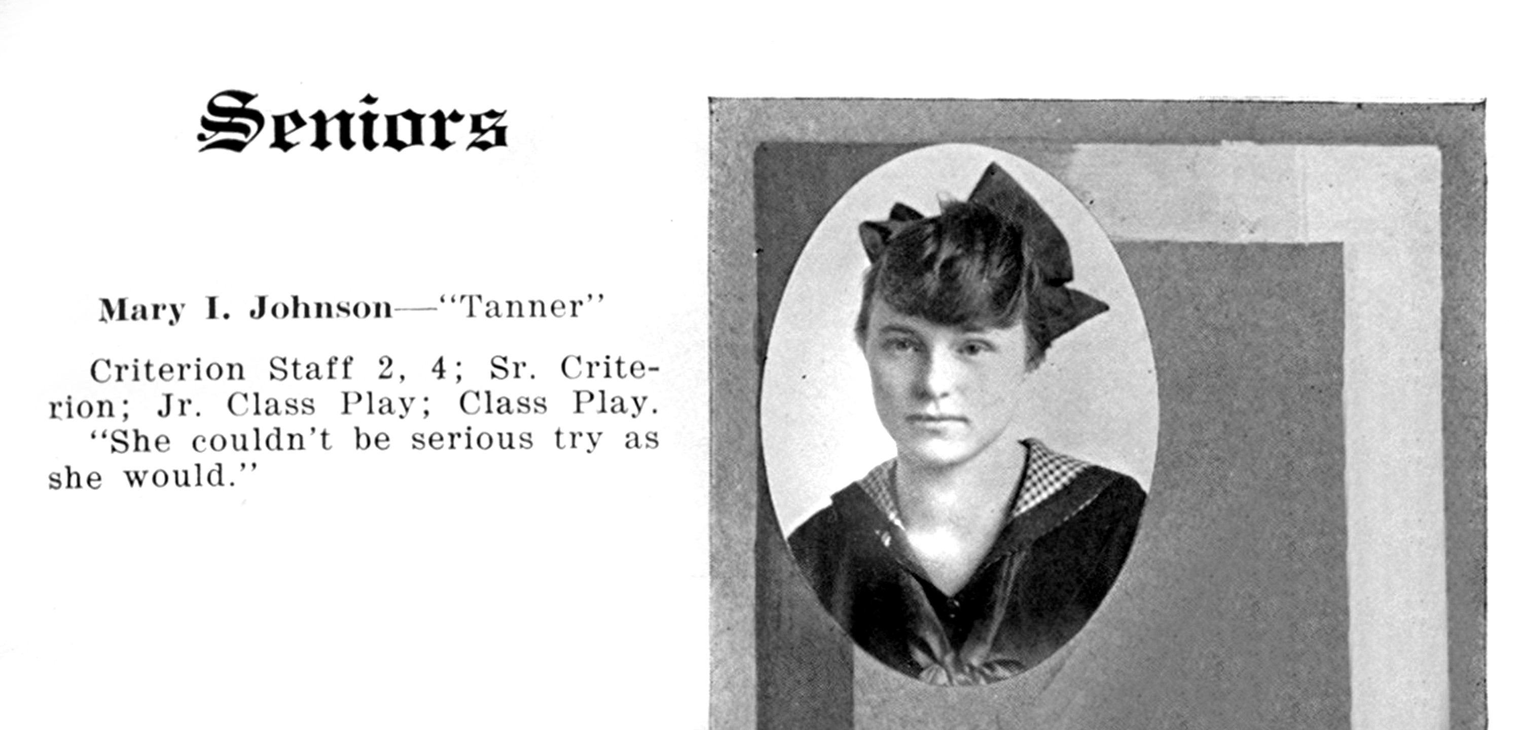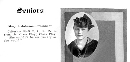 Mary Isabel "Tanner" Johnson was a member of the 1918 Graduating class of Waupaca High School , Waupaca, Waupaca Co., WI. Centurion Yearbook.