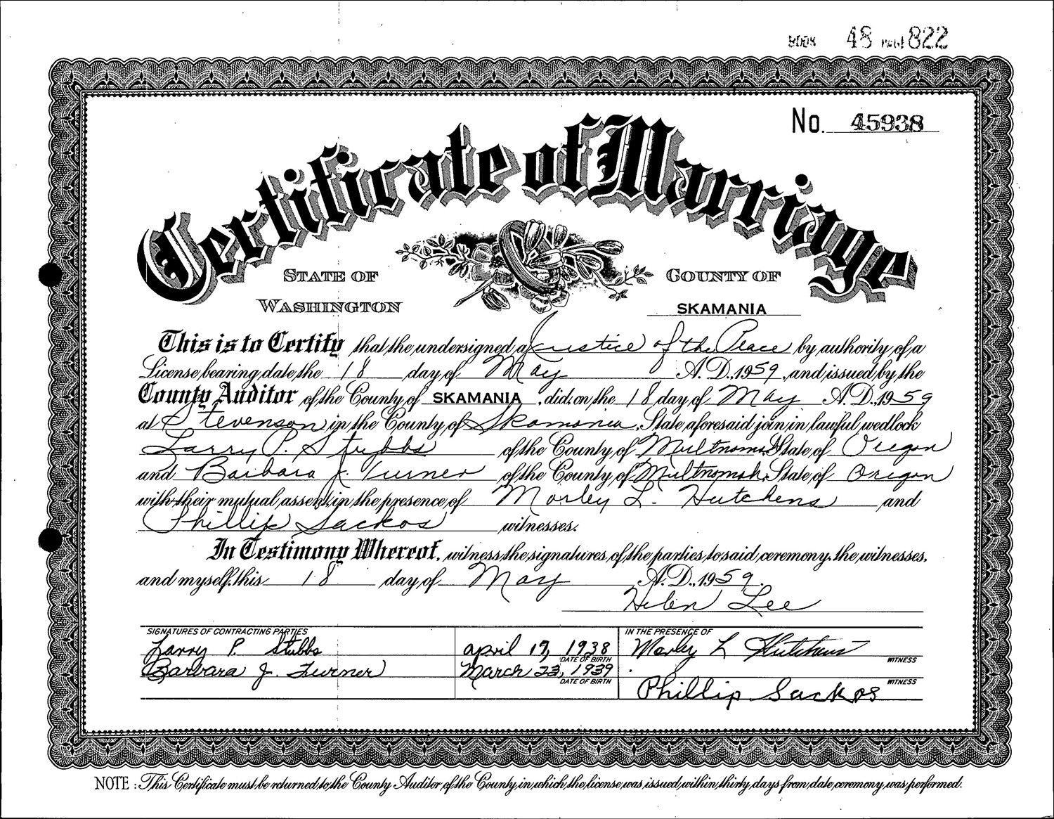 Larry Phillip Stubbs and Barbara J. Turner were married May 18, 1959, in Stevenson, Skamania Co., WA.