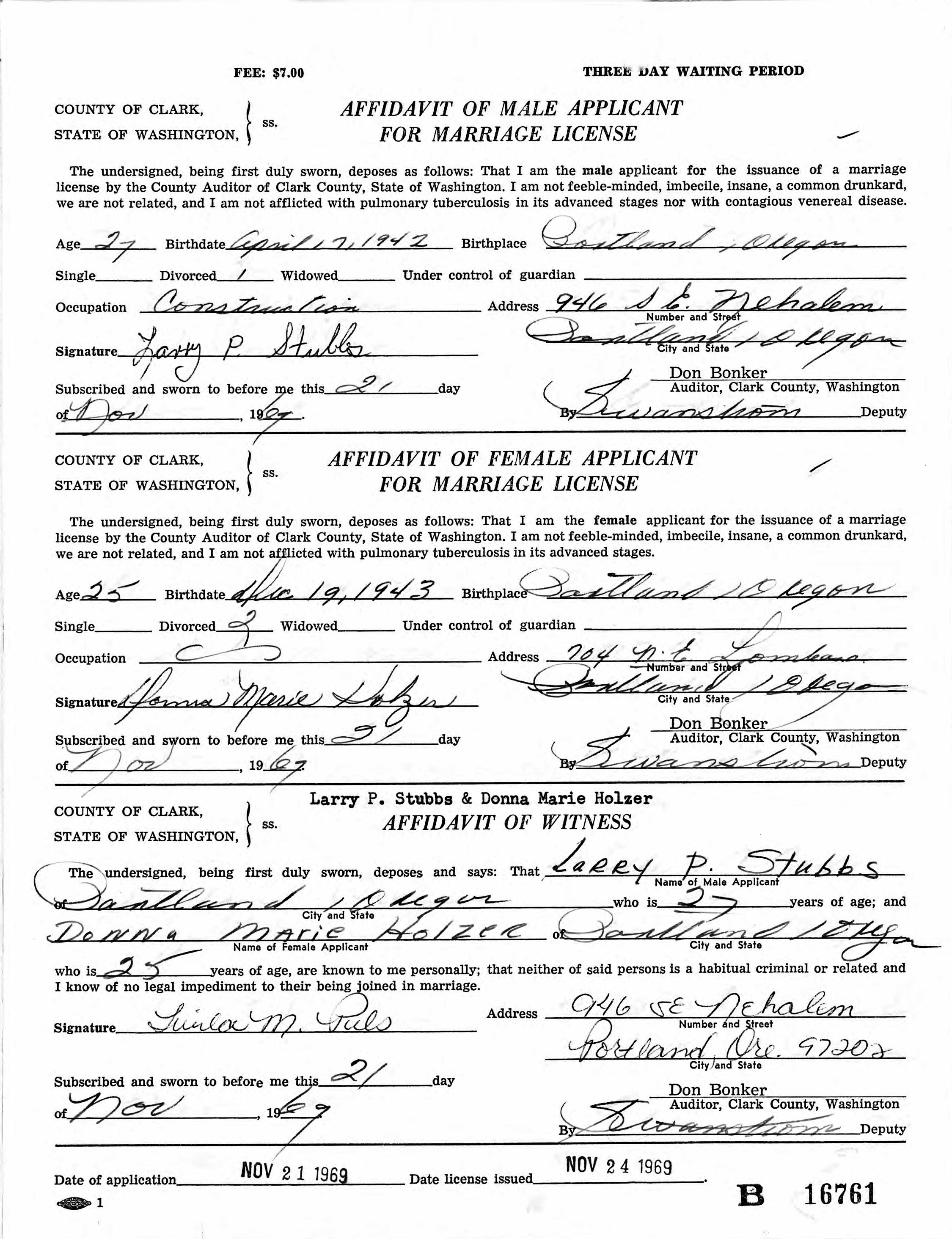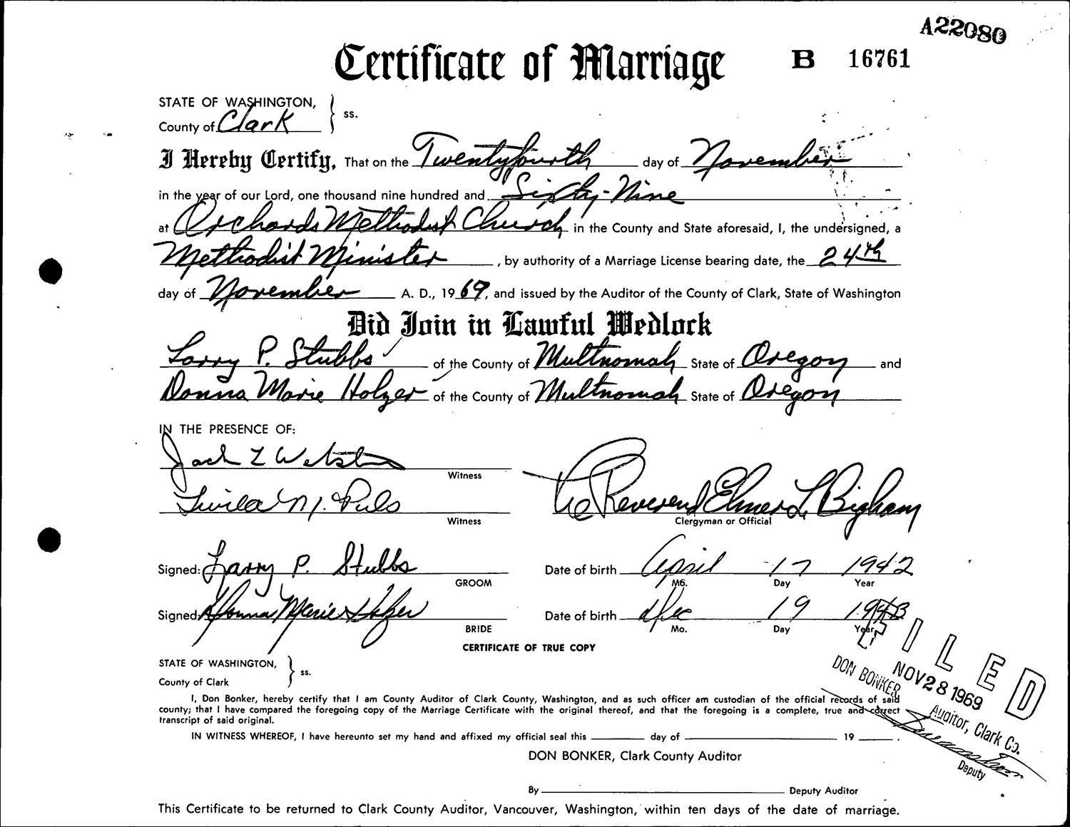 Larry Phillip Stubbs and Donna Marie (Dickerson) Holzer were married November 24, 1969, at Orchards Methodist Church, Orchards, Clark Co., WA.