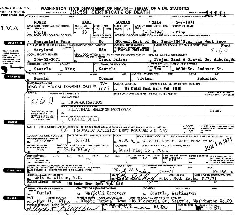 Roger Earl Gorman died May 7, 1971, in rural King Co., WA, at age 23. Buried in Washelli Cemetery, Seattle, King Co., WA.