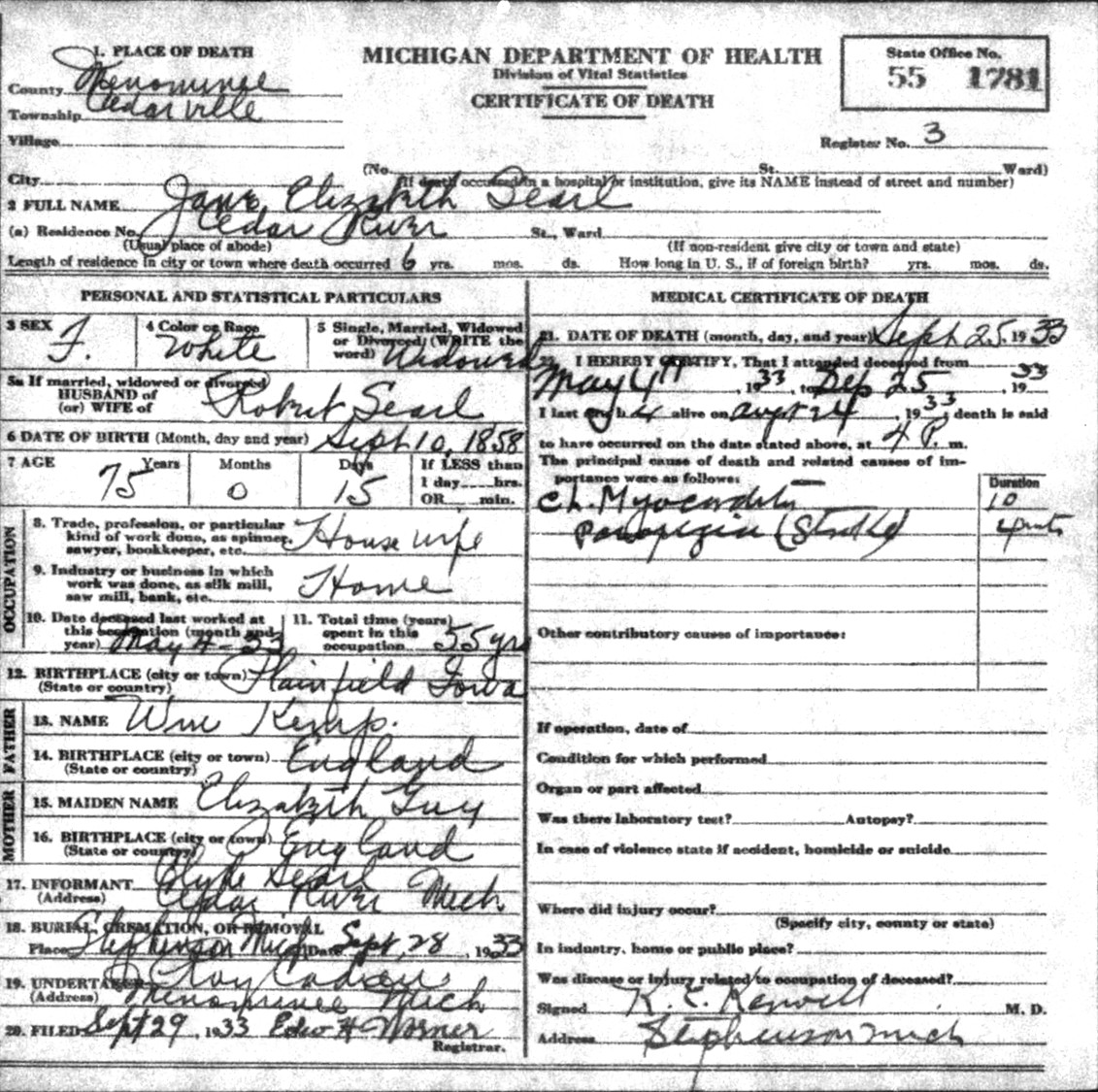 Jane Elizabeth (Kemp) Searl died September 25, 1933, in Cedarville, Menominee Co., MI, at age 75.