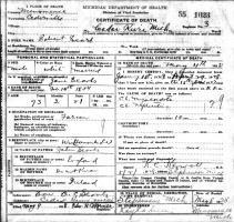 Robert Washington "Bob" Searl was born February 14, 1854, near Fond du Lac, Fond du Lac Co., WI, and died May 4, 1928, at the home of his son, Clyde, in Cedar River, Cedarville, Menominee Co., MI, at age 74. Buried in a non-cemetery location in Stephenson, MI. He is the son of John Searl of Broadoak (Braddock) Parish, County Cornwall, England and Elizabeth "Eliza" Bailey of Ireland.