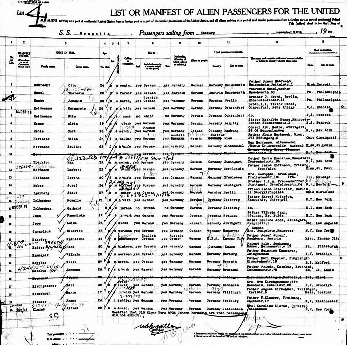 New York Passenger List: S. S. Mongolia, sailing from Hamburg, Germany, on December 20, 1923, with arrival January 1, 1924, in Port of New York.