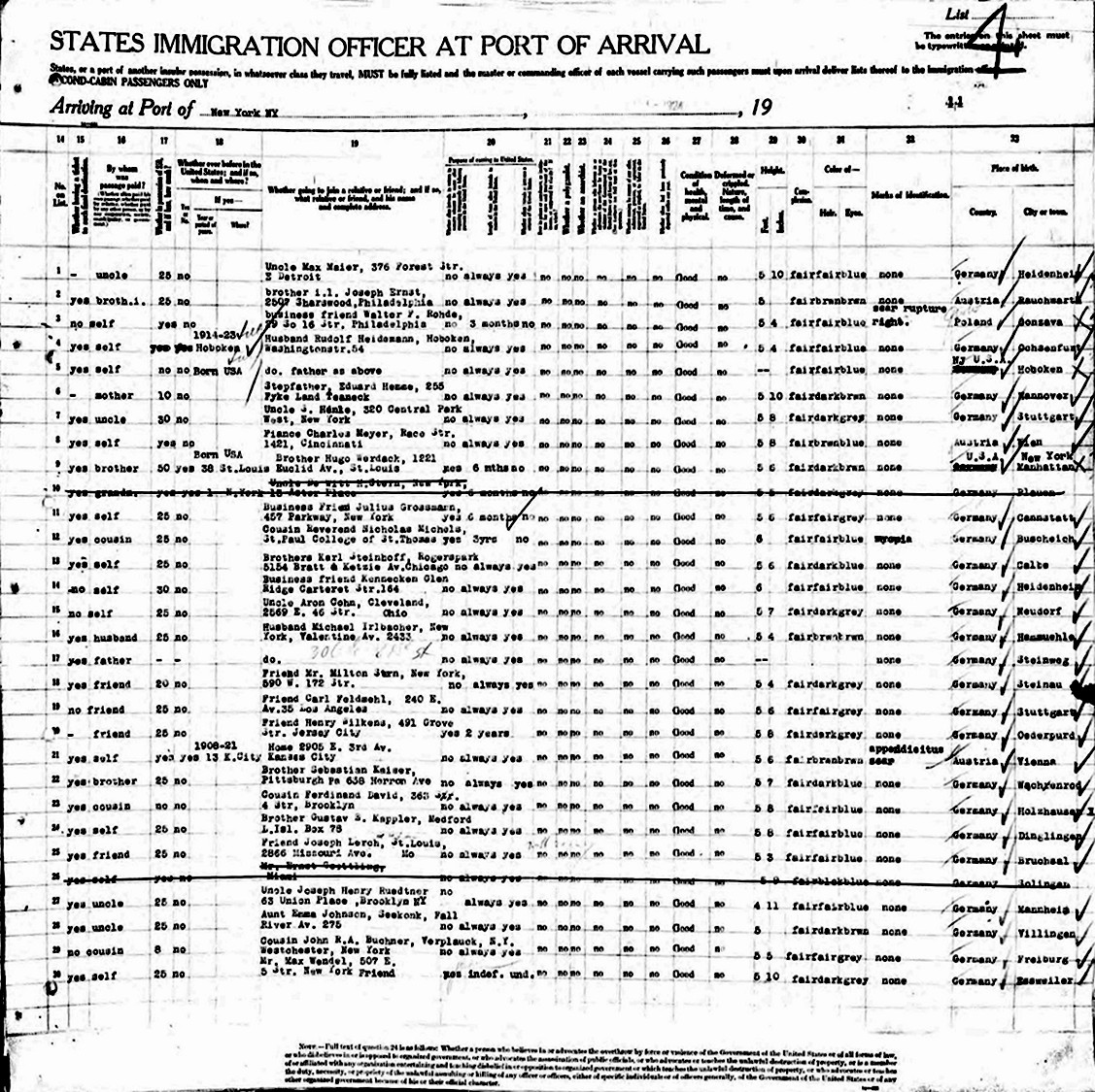 Theresia Fischer, age 26, a Cook, was living in Fessenbach, Germany, father is Paul Fischer, Fessenbach, has $25, travelling alone, final destination is New York, NY, to visit cousin, Wilhelm Schempf, 1540 2nd Ave., New York. She had not been in the United Stated before. 5 feet 4 inches tall, blonde hair, blue eyes, born in Tiergarten, Germany. Intends to become a permanent U. S. citizen.