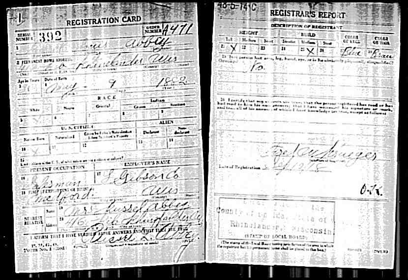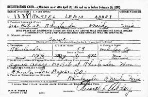 On September 12, 1918, the WWI Draft Registration Card and Registrar's Report at Rhinelander, WI shows Russel Louis Abbey was judged No. Russel L. Abbey signed his name on the form. Tall Height, Medium Build, Brown Hair and Blue Eyes. He was employed as Salesman at the L. Gibson Co. in Medford, WI. He was living at 416 Rib Street, Rhinelander, WI. His wife was his nearest relative.