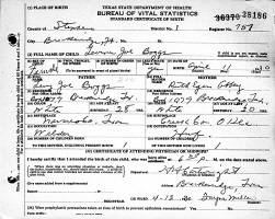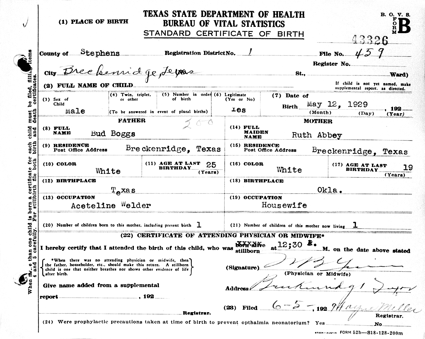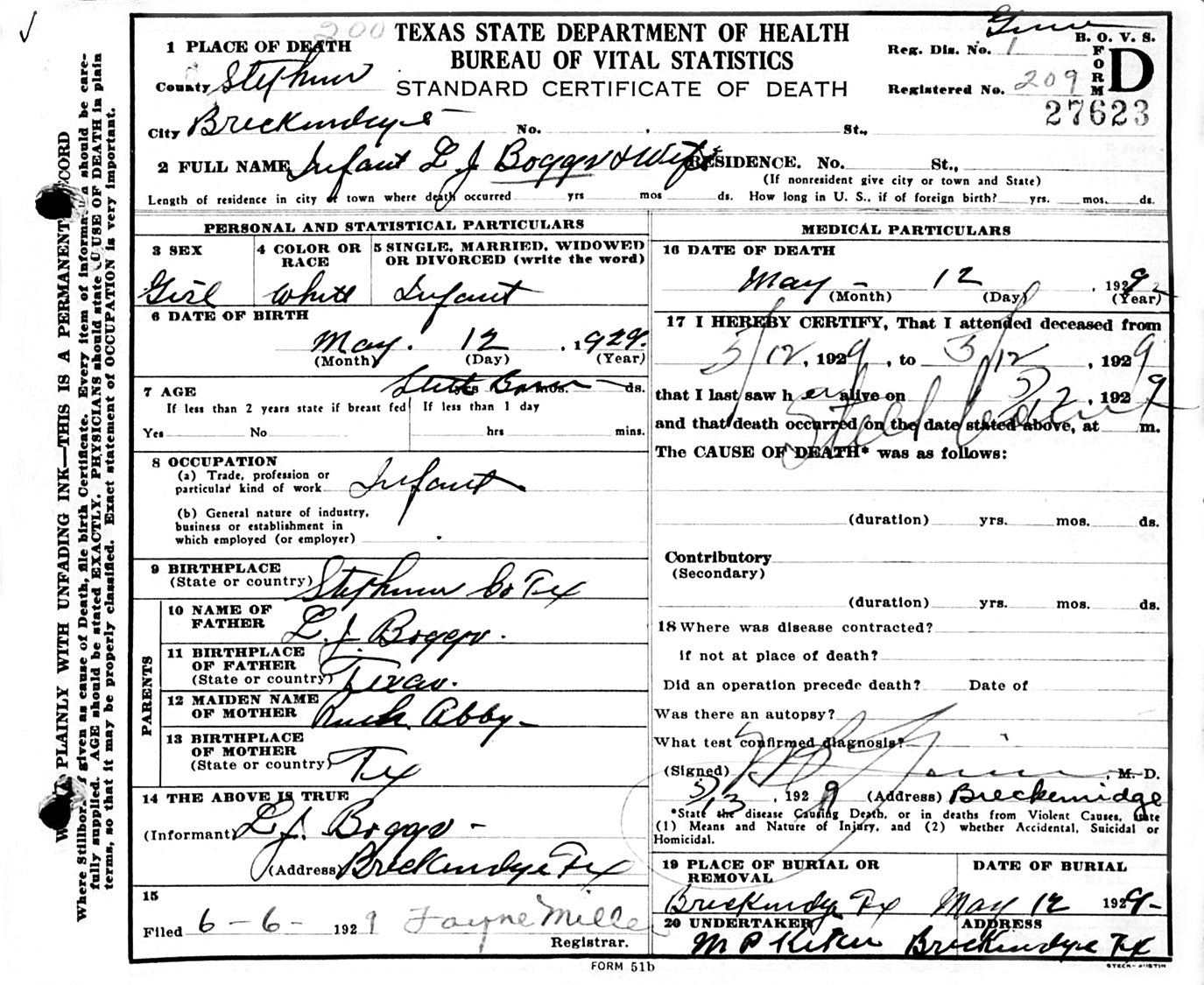 Born May 12, 1929, in Breckenridge, Stephens Co., TX; Died May 12, 1929, in