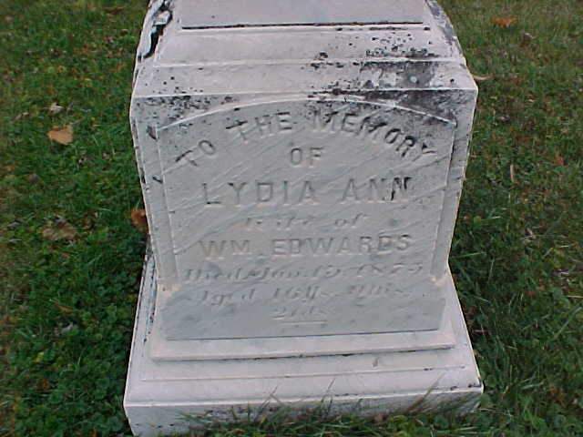 Lydia Ann Edwards is buried in Estabrooks Cemetery, Fond du Lac, Fond du Lac Co., WI. Many thanks to Larry and Linda Kopet for making this image available.
