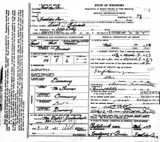 - Sarah Kuntz: Born October 1, 1855, in New Jersey; Died February 8, 1929, in Fond du Lac, Fond du Lac Co., WI (age 73). Buried in Estabrooks Cemetery, Fond du Lac Co., WI. Married (1) about 1871 in Unknown to Unknown Kuntz: Born Unknown; Died Unknown. Married (2) October 18, 1873, in Fond du Lac Co., WI, to Carl Gustav Jungnik: Born July 1851 in Prussia; Died August 9, 1929, in Appleton, Outagamie Co., WI (age 78). Buried in Riverside Cemetery, Appleton, Outagamie Co., WI. Divorced June 1, 1889, in Fond du Lac Co., WI. Married (3) September 8, 1904, in Chicago, Cook Co., IL, to Theodor "Theodore" Reichenbach: Born November 9, 1859, in Rotenfels (A. Rastatt), Baden, Germany; D ied June 15, 1910, in Fond du Lac, Fond du Lac Co., WI (age 50). Buried in Estabrooks Cemetery, Fond du Lac Co., WI.