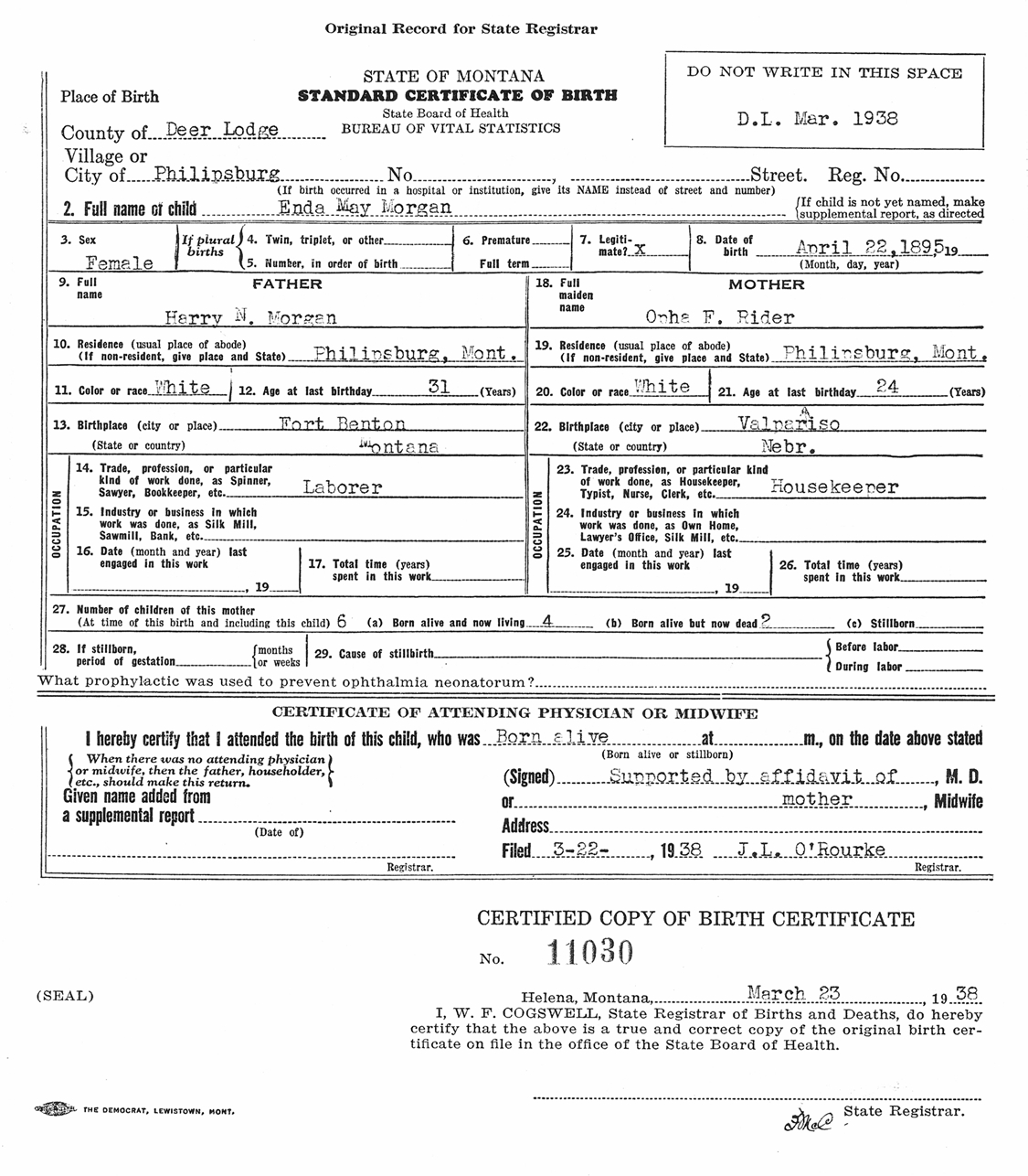 Edna Mae Morgan was born April 22, 1895, in Philipsburg, Granite Co., MT.