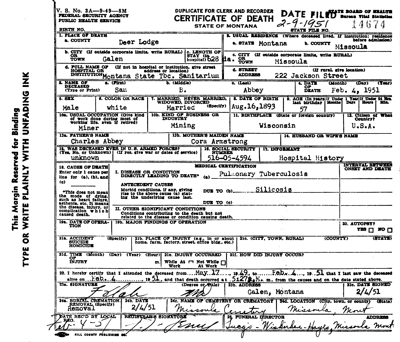 The 1950 U. S. Census taken on April 6, 1950, shows Sam B. Abbey (age 53) born in Wisconsin to United States-born parents, and one year ago was living in Missoula, MT, and with 4 years of School, is a widowed Patient, and is living at the Montana Tuberculosis Sanitarium, Deer Loge Co., MT.
