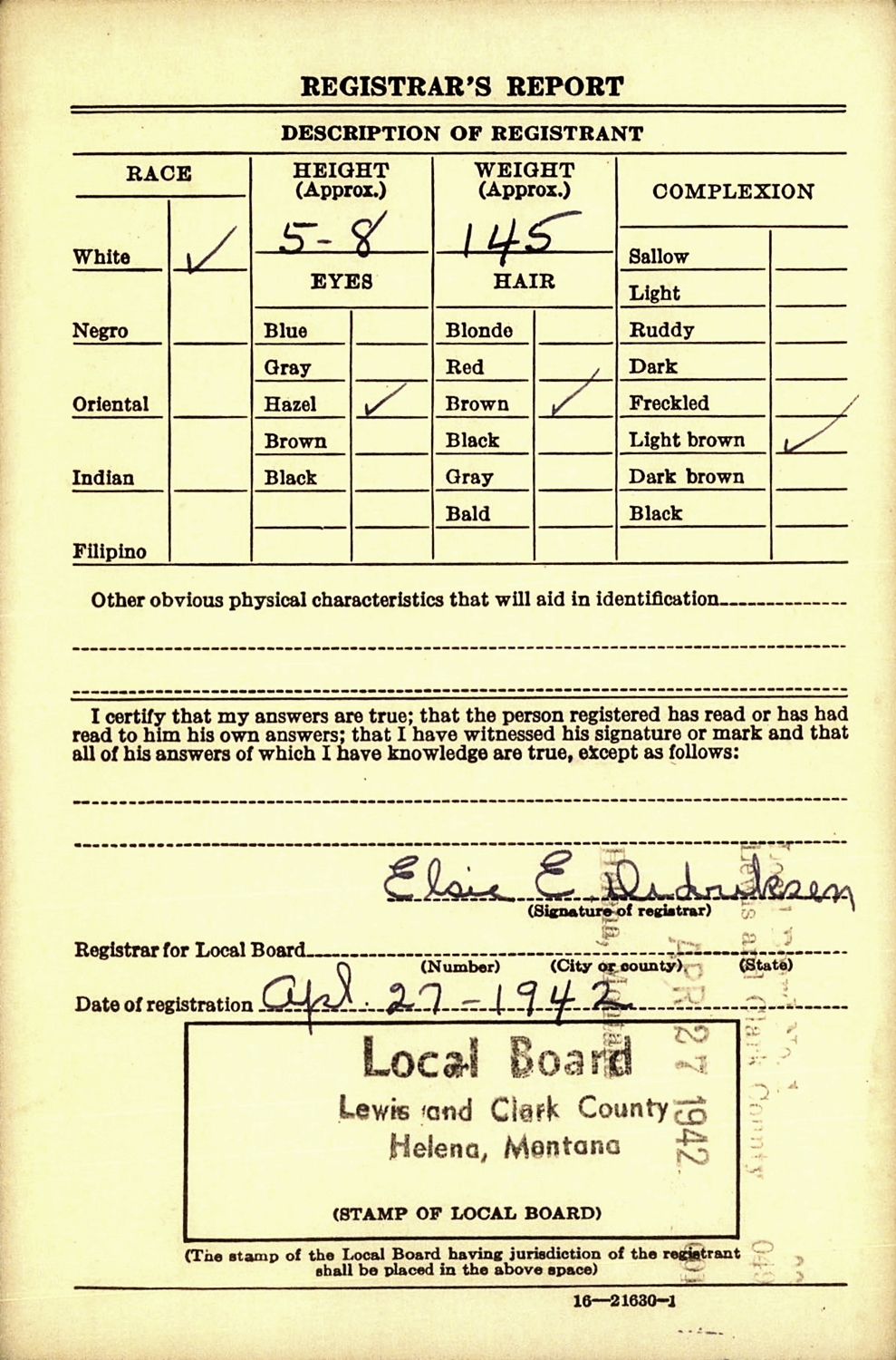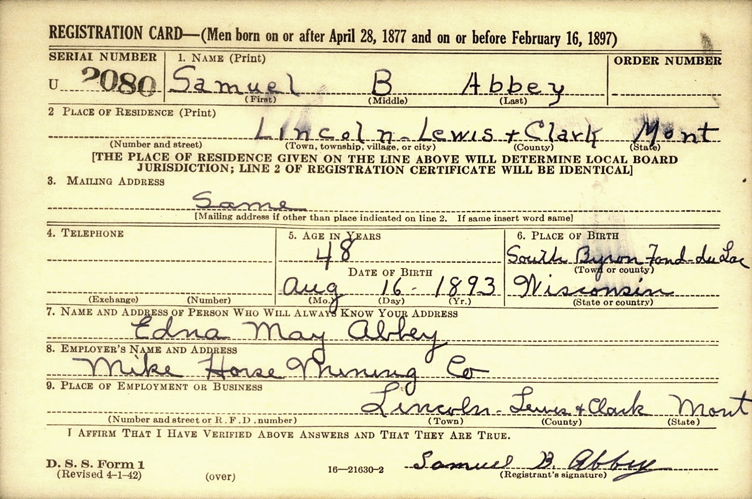The WWII Draft Registration Report dated April 27, 1942, shows Samuel B. Abbey (age 48) born August 16, 1893, in South Byron, Fond du Lac Co., WI, is employed by Mike Horse Mining Co. in Lincoln, Lewis and Clark Co., MT, and is living in Lincoln, Lewis and Clark Co., MT. The person who will always know his address is Edna May Abbey.