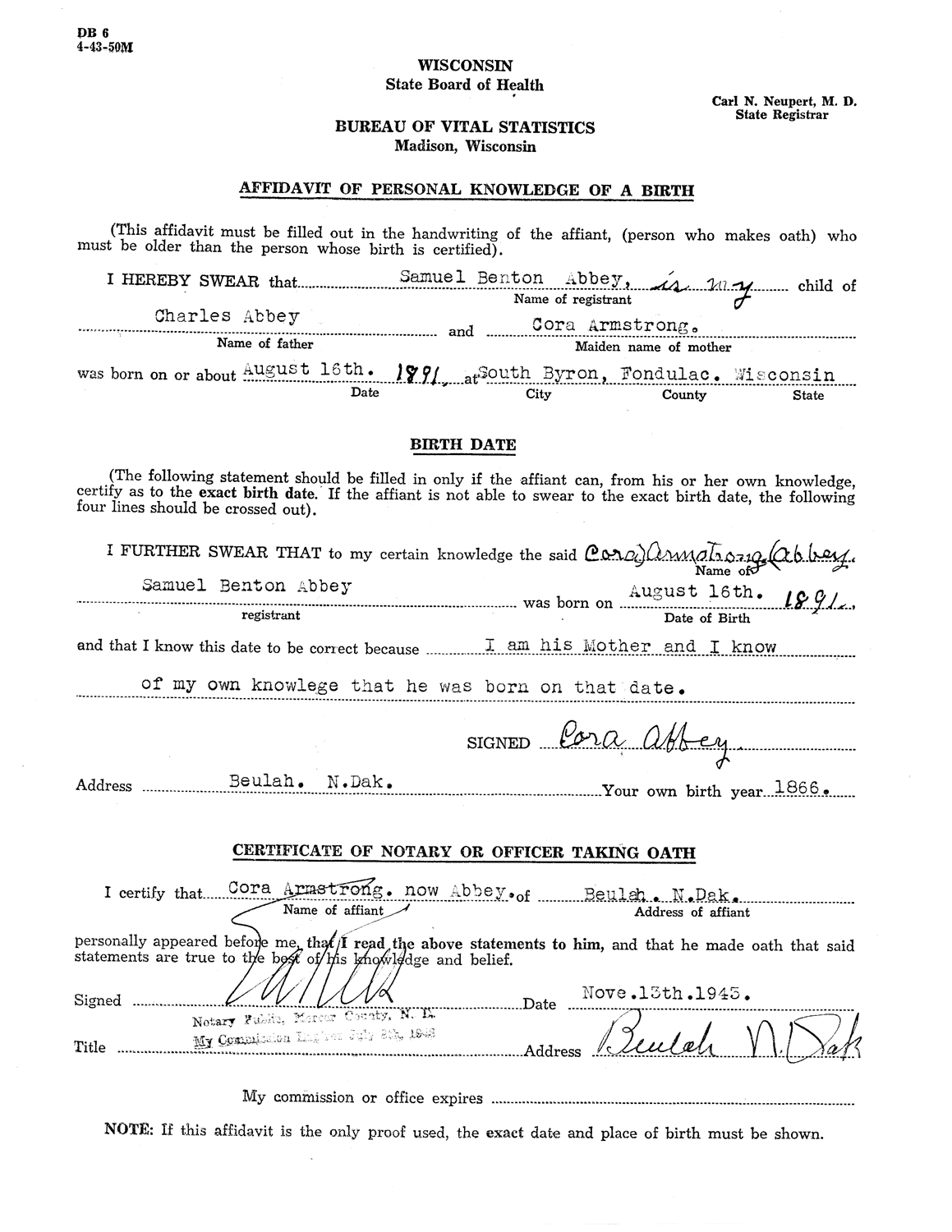 Leigh Larson note: This Affidavit of Birth was given by his mother, Cora (Armstrong) Abbey, in Beulah, ND, on November 13, 1943, when she was 83 years old. Please note that the year was not typed, which probably means that she could not remember the year of his birth, and that it was filled in afterward. His actual year of birth is 1892. It is also interesting to note that the Wisconsin State Registrar, Carl N. Neupert, M. D., is likely the son of Dr. Carl von Neupert, who successfully operated on Cora's daughter in Wisconsin in June, 1896.