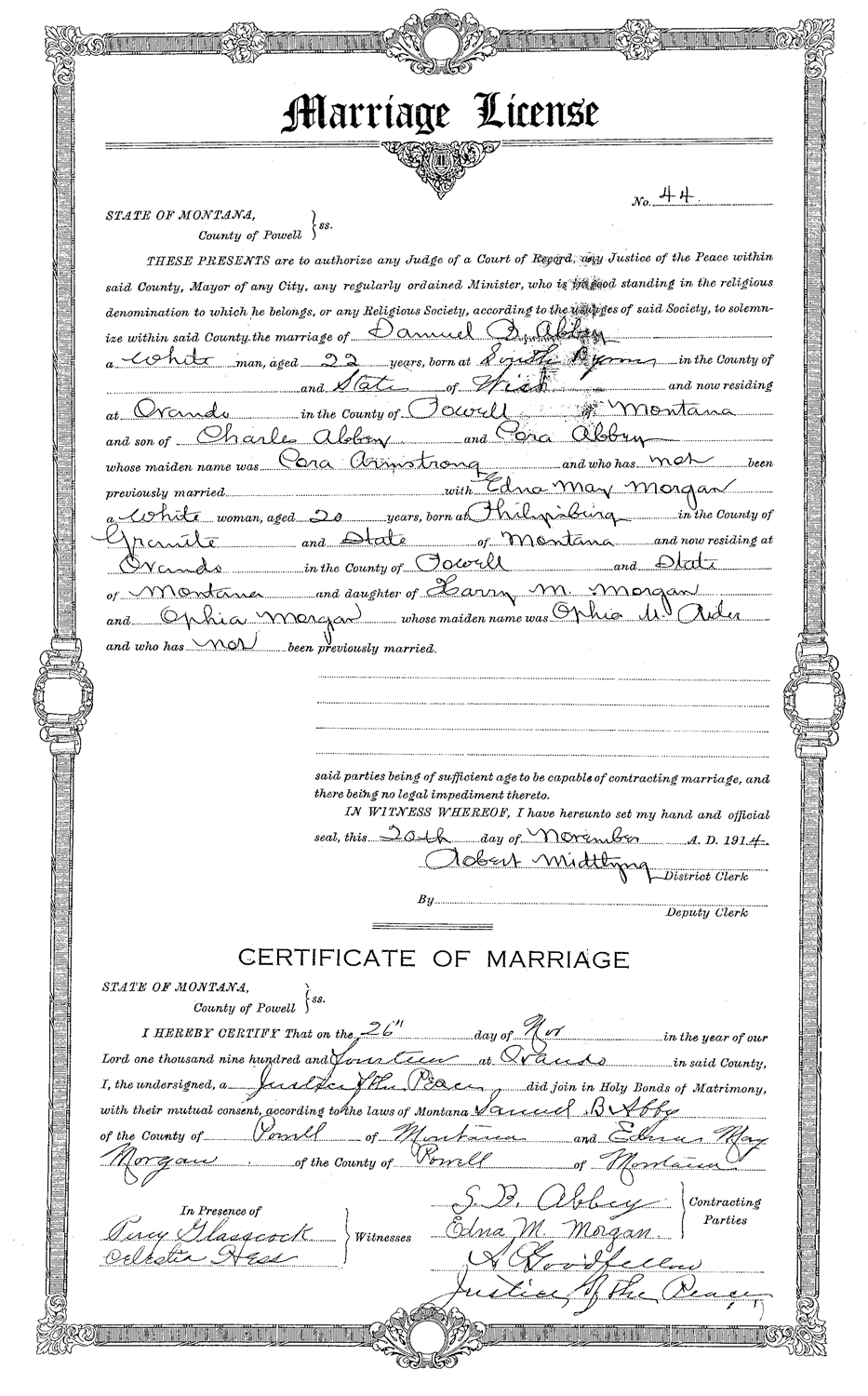 Samuel Benton "Sam" Abbey (age 22), a bachelor, and Edna May Morgan (age 19), a maiden, were married November 26, 1914, in Ovando, Powell Co., MT.