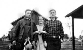 Samuel Benton "Sam" Abbey, Cora Adella (Armstrong) Abbey, and Oran Ralph Abbey, North Dakota, about 1924. Photo courtesy of Kay Koslan.