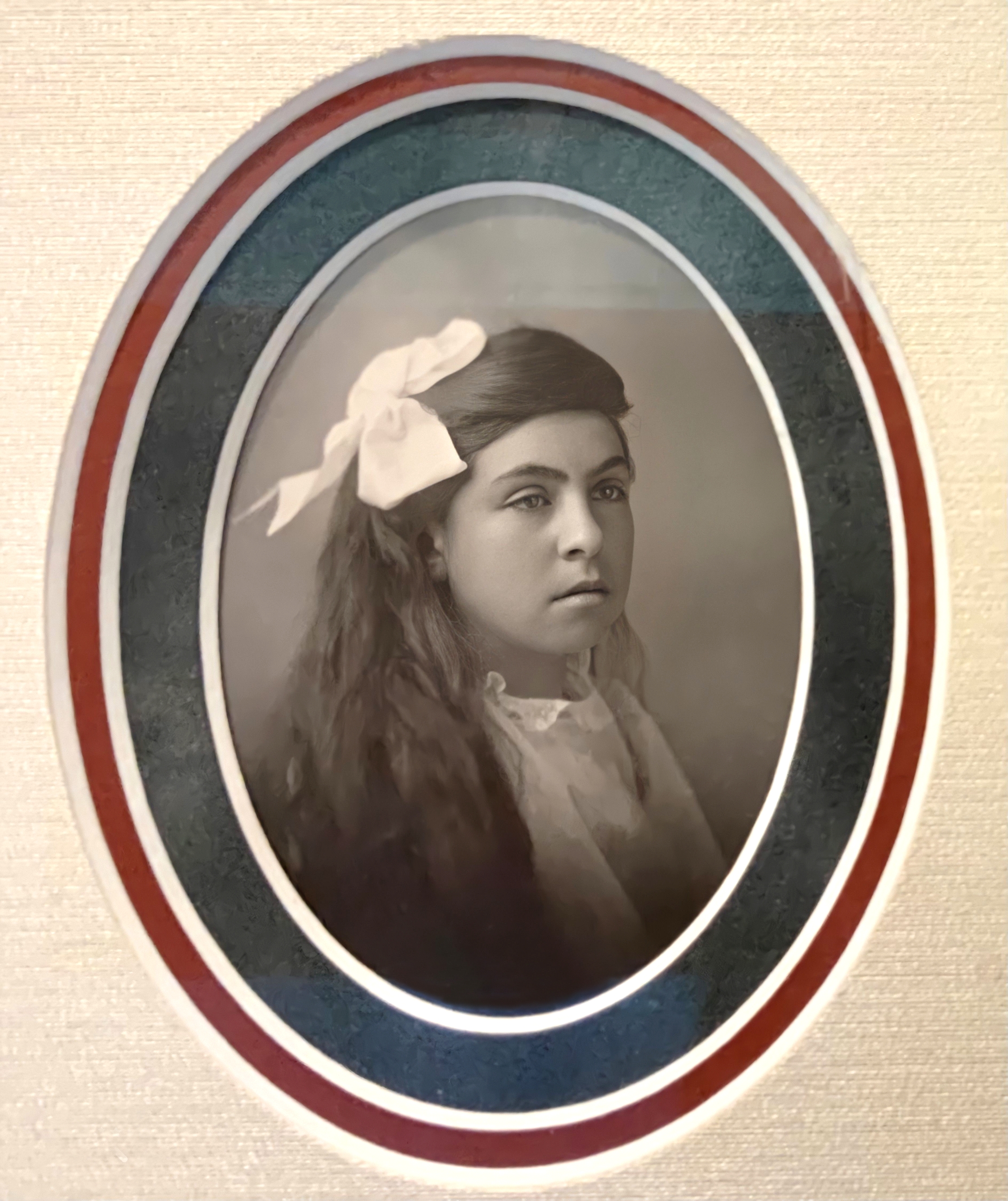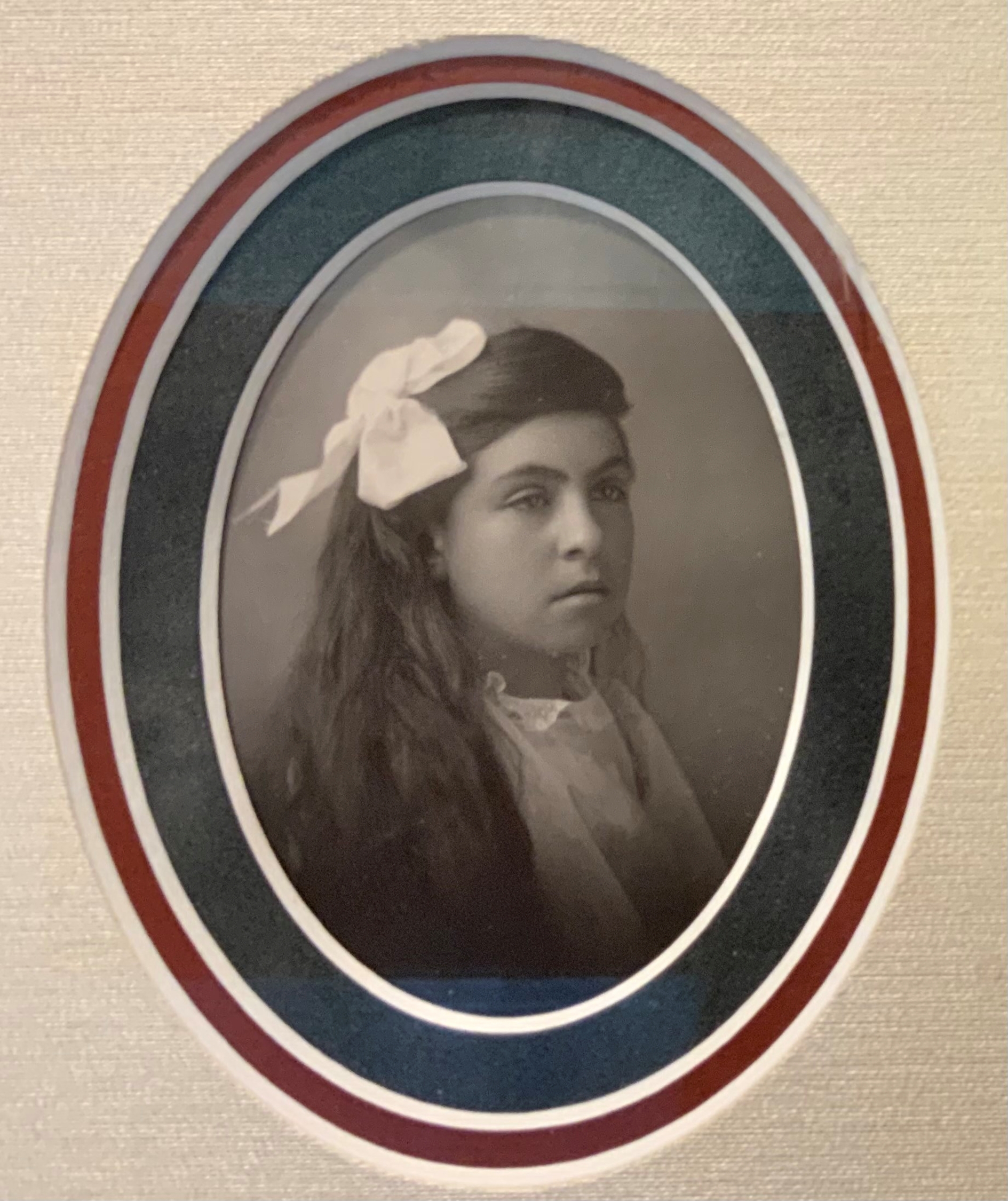 Edna May Morgan, about 1910. The original framed picture, on the left, was provided by Tiffani Mercer, daughter of Thomas Sinclair Dietz Mercer and Jean Kay (Brooks) Mercer, and granddaughter of Virgil Wilmer "Chick" Brooks and Katheryn May "Kay" (Abbey) Brooks, and great-granddaughter of Samuel Benton "Sam" Abbey and Edna Mae (Morgan) Abbey.