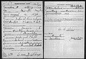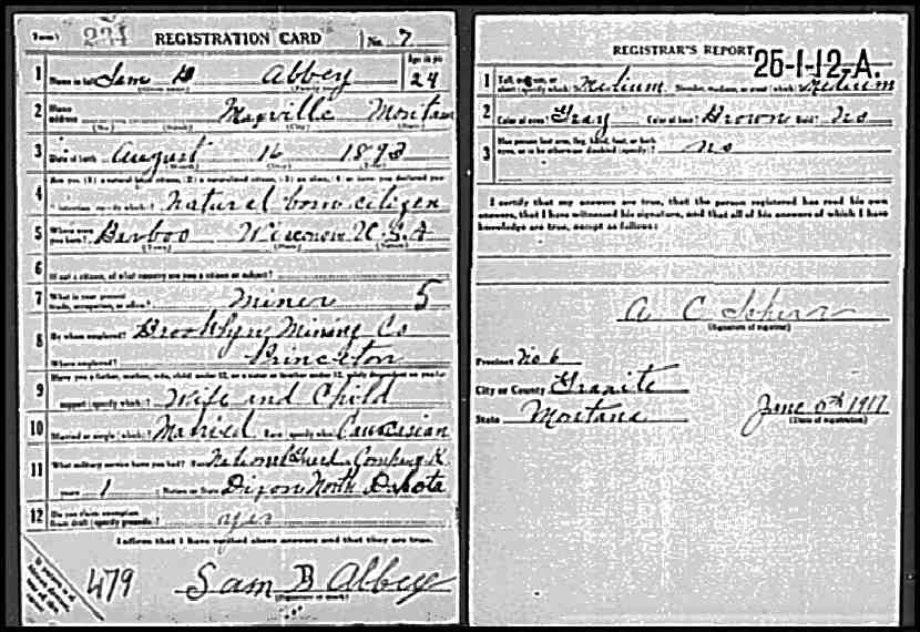 The WWI Draft Registration Report dated June 5, 1917, shows Sam B. Abbey (age 24) born August 16, 1892, in Baraboo, WI, is a Miner who is employed by Brooklyn Mining Co. in Princeton, MT, and is living in Maxville, MT. He is married and has one child. He has had one year of military service with the National Guard, Company K, Dixon, ND.