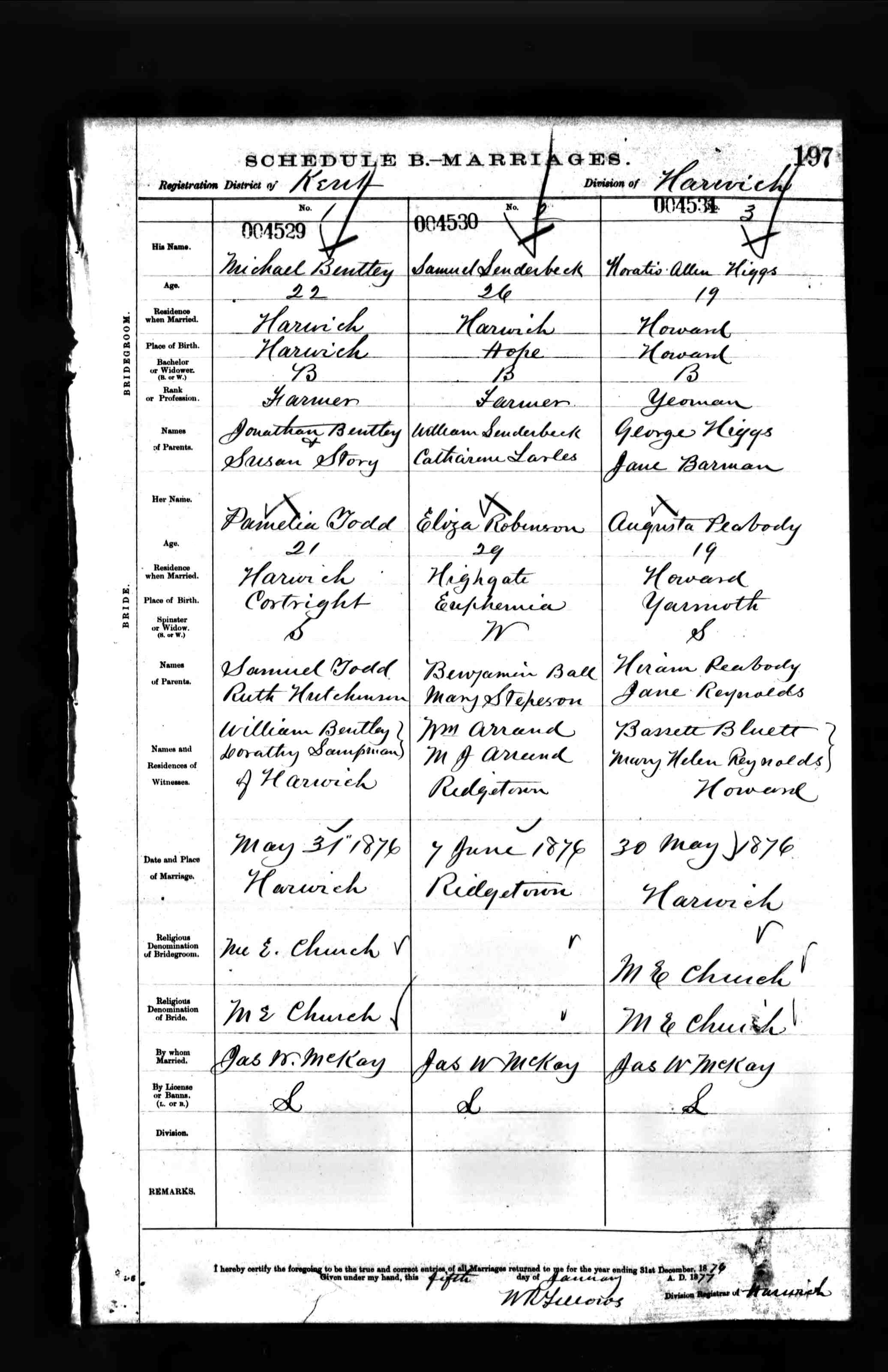 On June 7, 1876, Samuel Lenderbeck (age 26) born in Hope Twp. and a resident of Harwich, is a bachelor Farmer with parents William Lenderbeck and Catharine Sarles. Eliza Robinson (age 29) born in Euphemia Twp., Kent Co., Ontario, Canada and a resident of the Village of Highgate, Kent Co., Ontario, Canada is a widow with parents Benjamin Ball and Mary Stepeson.