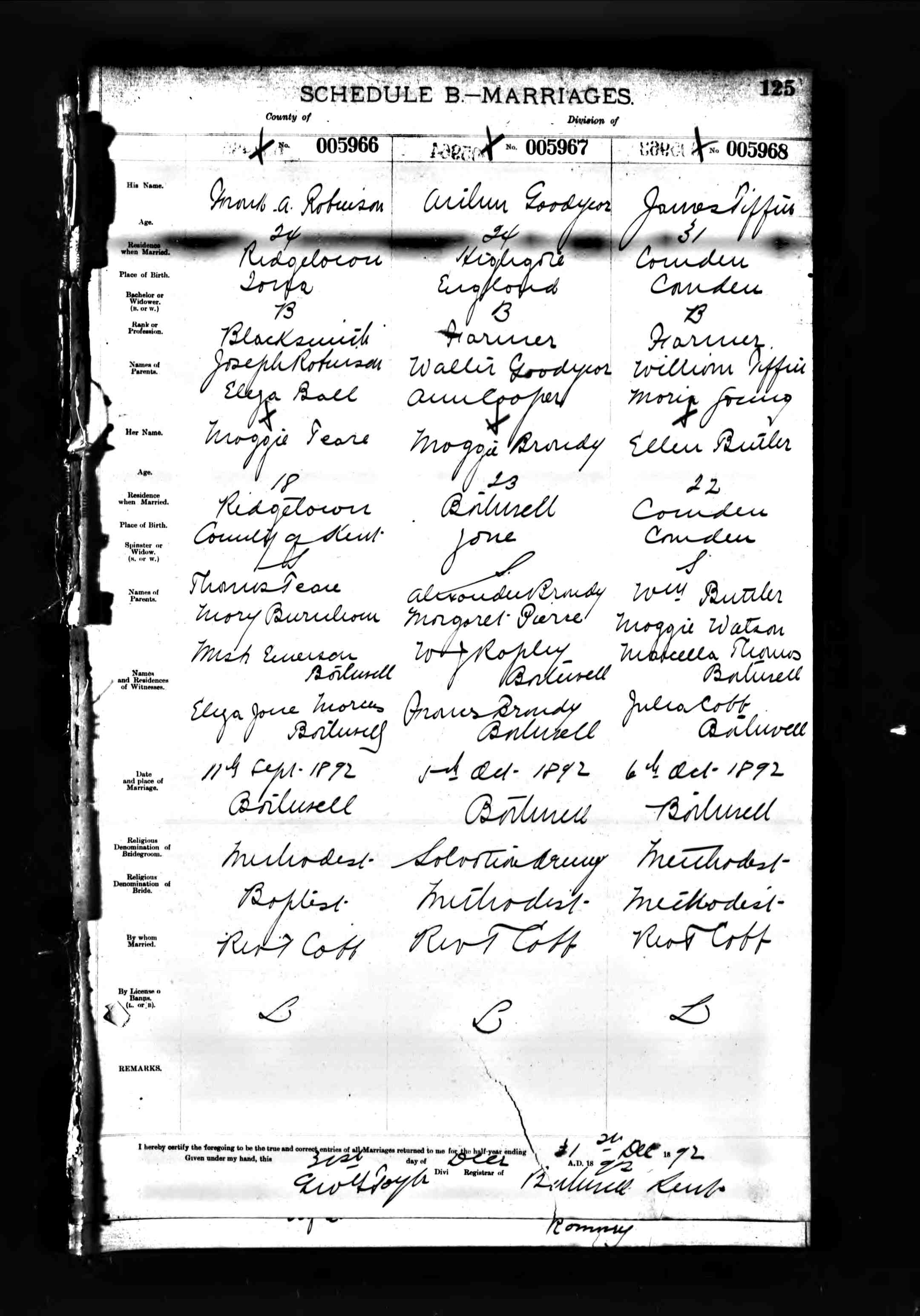 - Frank A. Robinson: Born about 1868 in Iona, Ontario, Canada; Died Unknown. Married September 11, 1892, in Kent, Kent Co., Ontario, Canada to Maggie Teare: Born about 1874 in Kent Co., Ontario, Canada; Died Unknown.